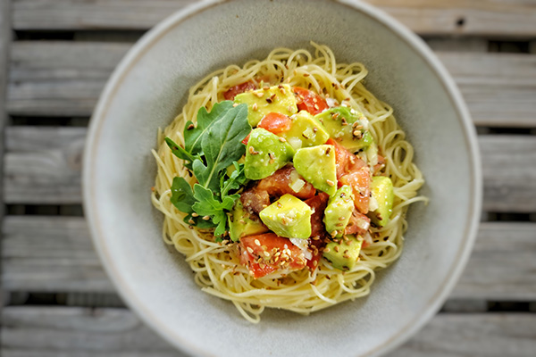 Angel Hair Pasta with Lemon Shio Koji Dressing, Avocado and Tomato
