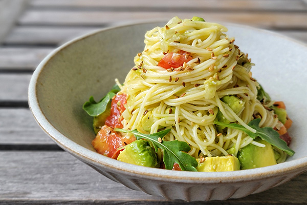 [アボカドとトマトの塩麹ドレッシング和え冷製パスタ]