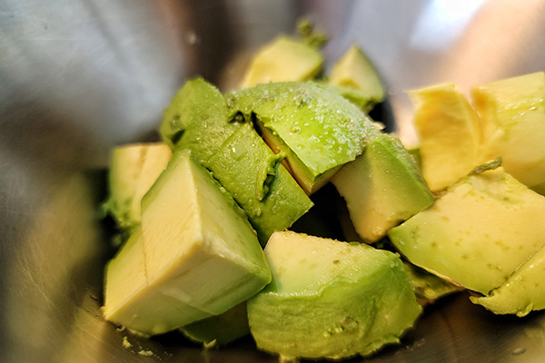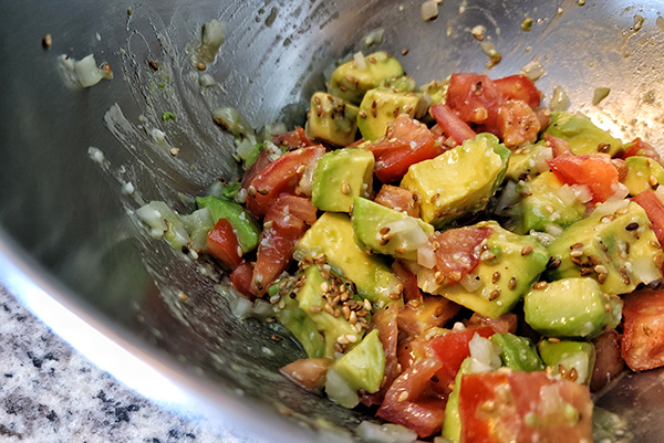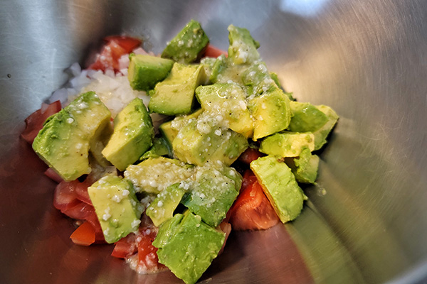 In the end, I put avocado, tomatoes, and onion all in one bowl to season. However, I prefer doing a little prep work for the avocado before adding with the other components. It’s a few simple steps but makes a difference.