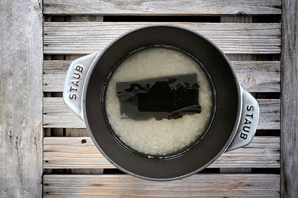 - Transfer the rice to preferably a cast iron pot with a heavy lid or something similar. Pour water and make the rice leveled. Place kombu sheet on top of the rice (submerge in the water) and cover with the lid.