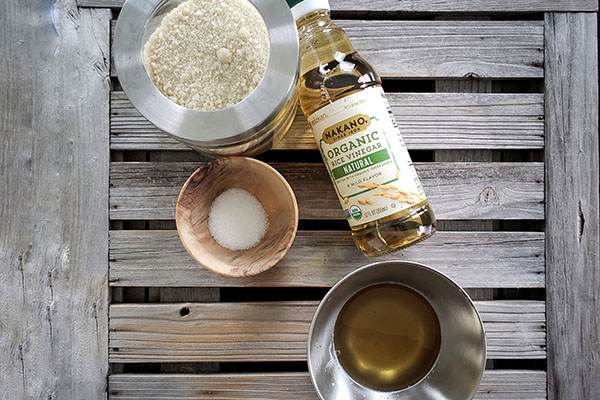 - Make suzhizu (seasoned vinegar mixture) first. In a prep bowl, combine rice vinegar, sugar and salt. Whisk together until well blended. Set aside. You may see the sugar and salt not quite dissolved which should be fine once it is mixed with warm rice. Alternatively, you may cook the mixture on the stove on medium heat just until the sugar and salt is dissolved. Remove from the heat and let it cool down until rice is done.