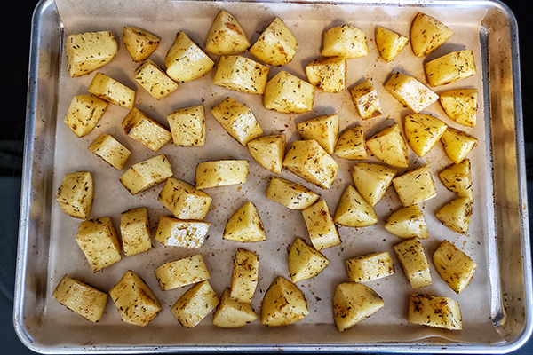 - Spread the potatoes onto a sheet pan in a single layer. Bake them in the oven for 40-45 minutes until crispy and golden brown.