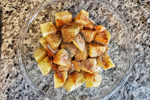 - Meanwhile, season the potatoes. In a large prep bowl, combine yellow potatoes, extra virgin olive oil, dried thyme, onion powder, garlic powder, paprika powder, sugar, salt and black pepper. Toss them until potatoes are well coated with the seasonings.