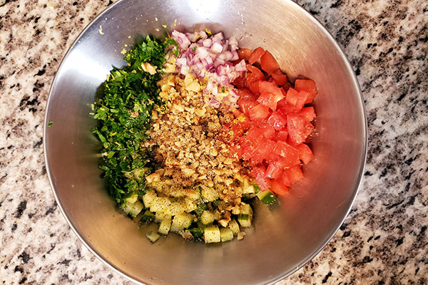- In a prep bowl, combine toasted walnuts, cucumber, tomatoes, red onion, parsley, lemon zest, lemon juice, salt and 1/2 tbsp extra virgin olive oil. Toss lightly until well combined.