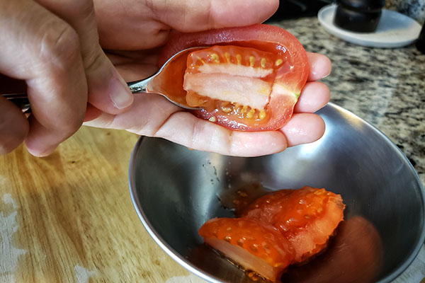 The reason for using Roma tomatoes is for the sweetness and mainly for the texture. I don’t like my salad (or topping like this recipe) ending up wet and soggy. The flesh of Roma tomatoes is meatier and it has less juice than other kinds. I also remove the core and seeds to really ensure the desired consistency that I’m looking for.