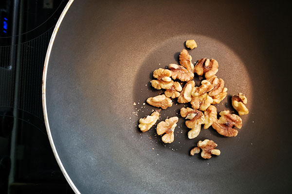 Make sure to toast the walnuts! There’s nothing wrong with eating raw walnuts however, we need that toasted aroma factor for the dish! It’s so easy to do. First, place the raw unsalted walnuts in a pan. Cook over medium high or medium heat. It should take about 5-7 minutes for them to start browning and releasing the irresistible aroma. Just make sure that you keep your eye on them so you don’t burn!
