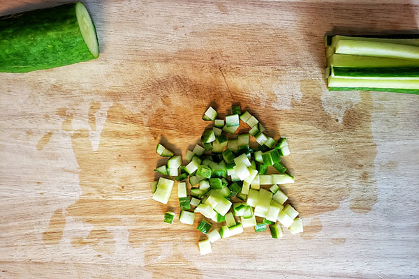 - 1.5 oz English cucumber diced small (1/4 cup diced)