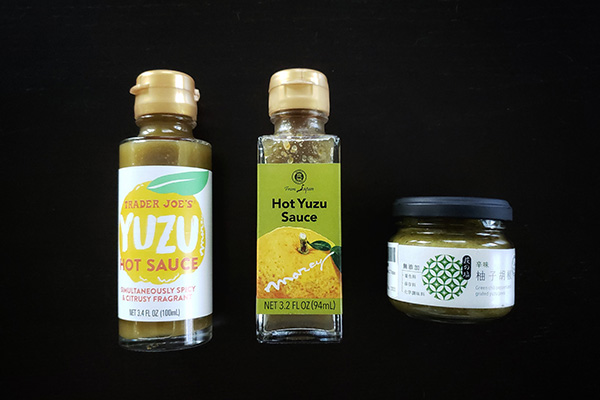 On the other hand, there is a similar product called yuzu kosho [柚子胡椒.] Yuzu kosho isn’t a new product yet it has become more common in the Japanese kitchen in the past two decades (my personal opinion.) It’s a specialty ingredient from Kyusyu region but now it’s available everywhere. Unlike the hot yuzu sauce, it’s a paste form and it doesn’t contain vinegar so there is no tangy taste to it. Also, it has more intensity in the spice level and its aroma. I’m pretty sure that hot yuzu sauce was invented after the popularity of the yuzu kosho.