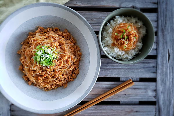 Have you had the Chinese dish called mapo tofu? It’s a popular Sichuan style tofu dish that’s spicy and numbing from lots of chilis and Sichuan peppercorns. As far as I know, mabo harusame is a Japanese interpretation of the Chinese style dish that tastes similar to mapo tofu. It’s a completely different dish than the mapo tofu that you may be familiar with but the concept is the same.