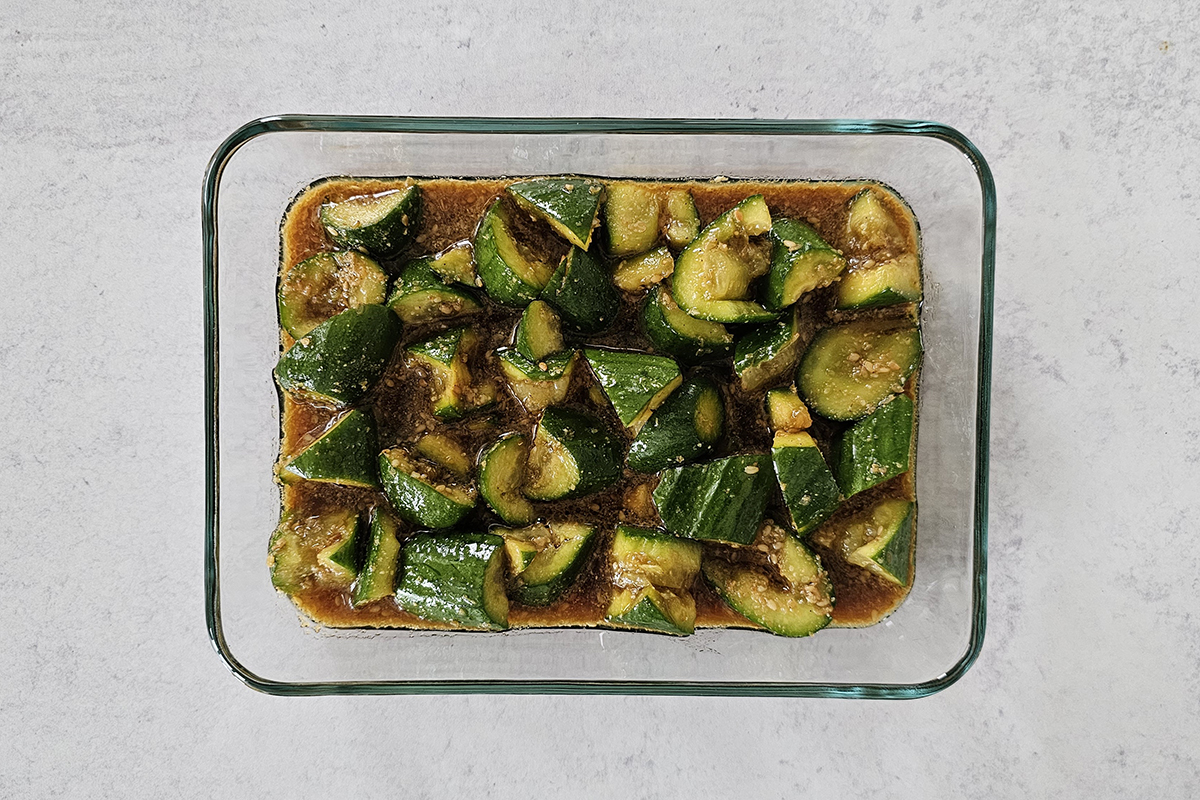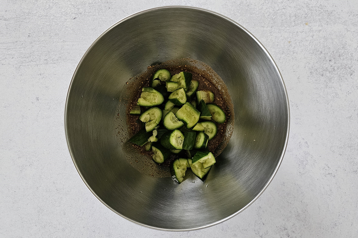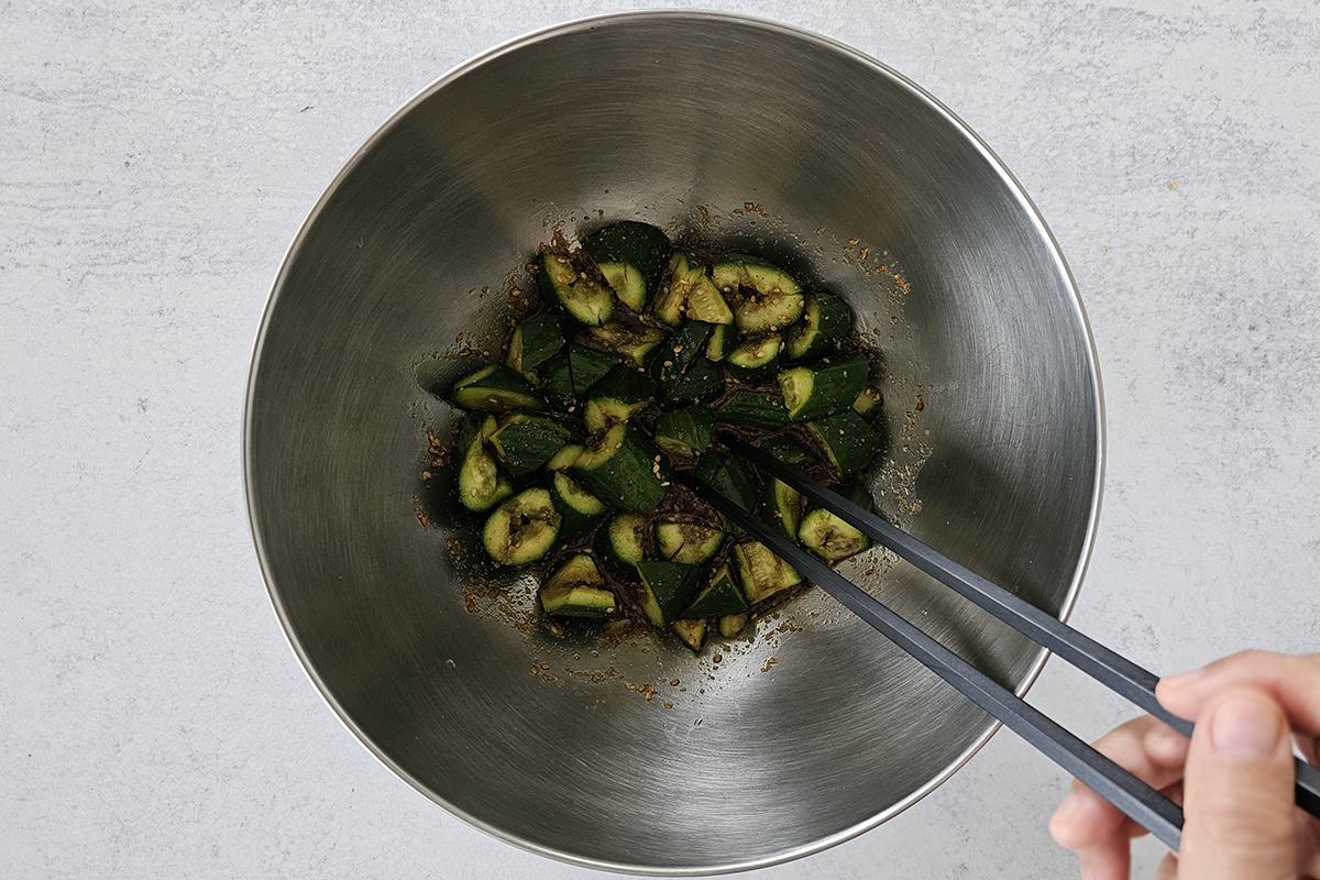 - Add the cucumber to the bowl and toss them together until well coated with the sauce. Then, add toasted sesame oil and give it a quick toss.