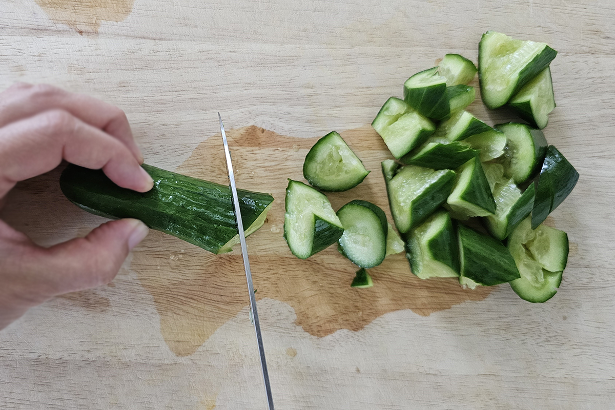 - Gently crush the cucumber by pressing it with palms. Cut into chunks (about 3/4-inch.) Set it aside.