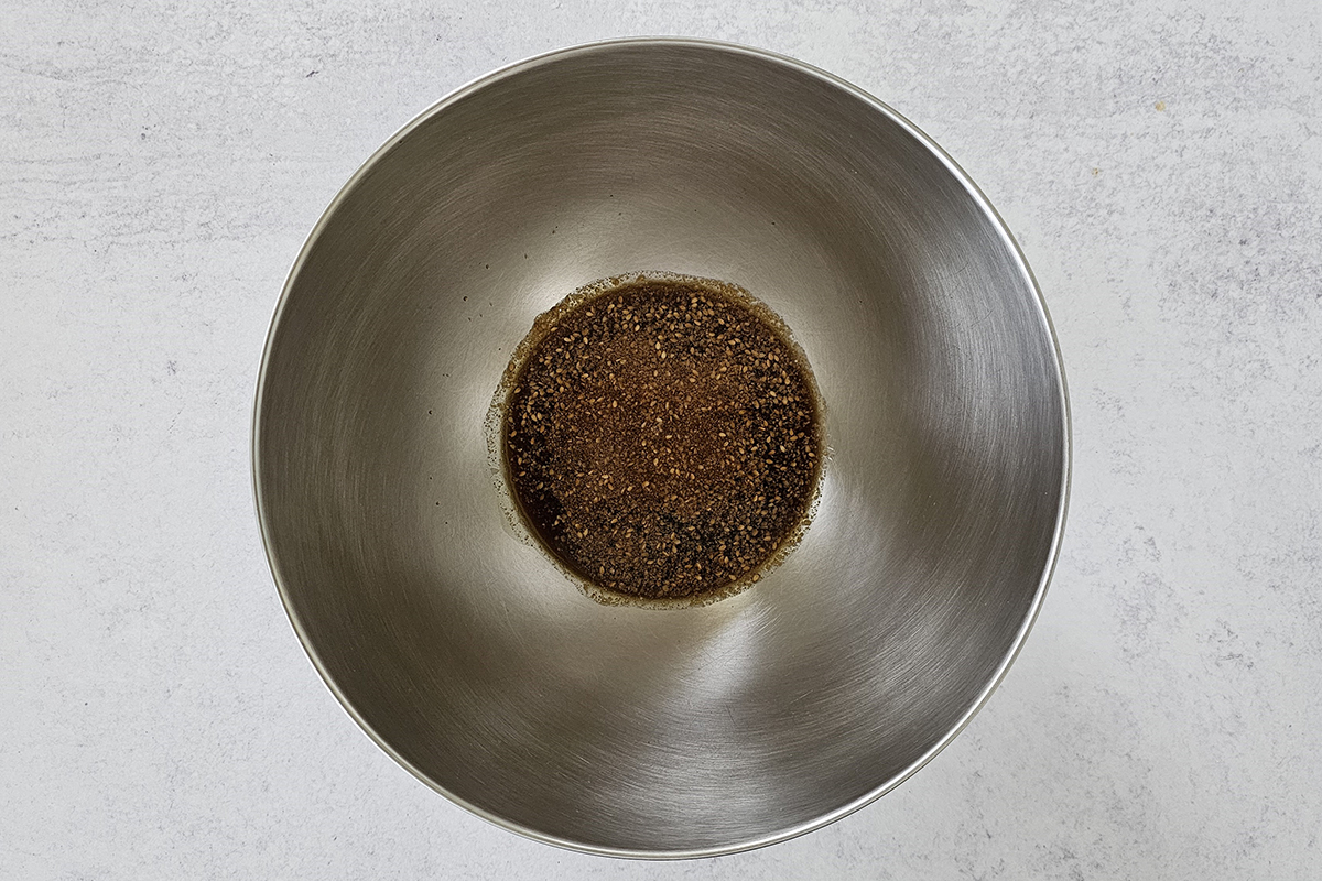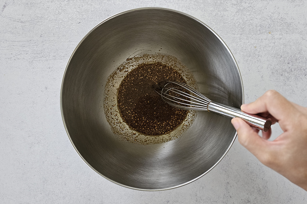 - Meanwhile, prepare the sauce. In a large bowl, combine soy sauce (or tamari), rice vinegar, cane sugar, ground toasted sesame seeds, and Japanese chili pepper powder. Mix well until well combined.