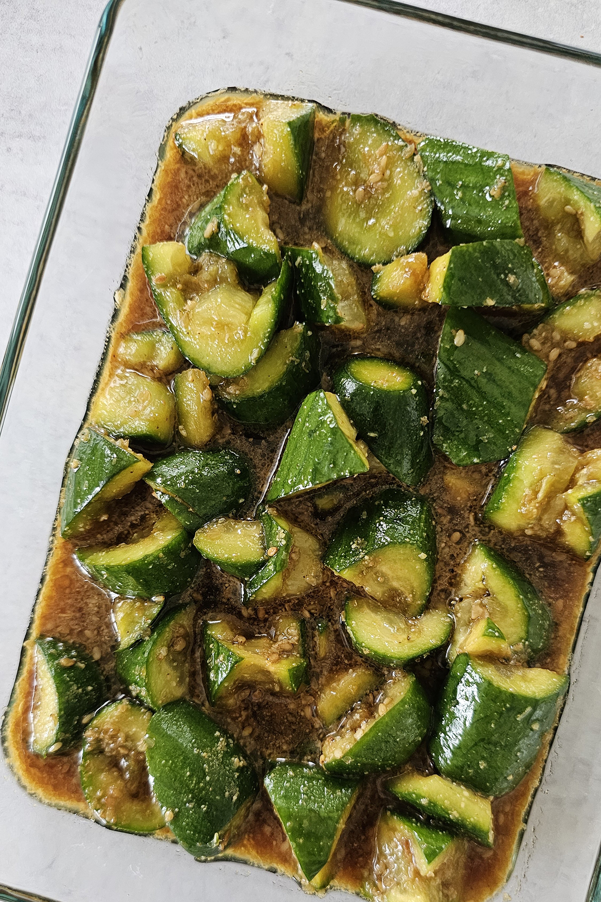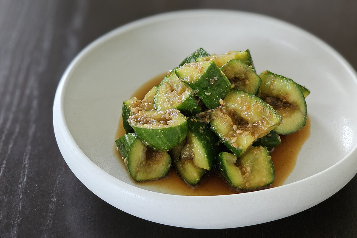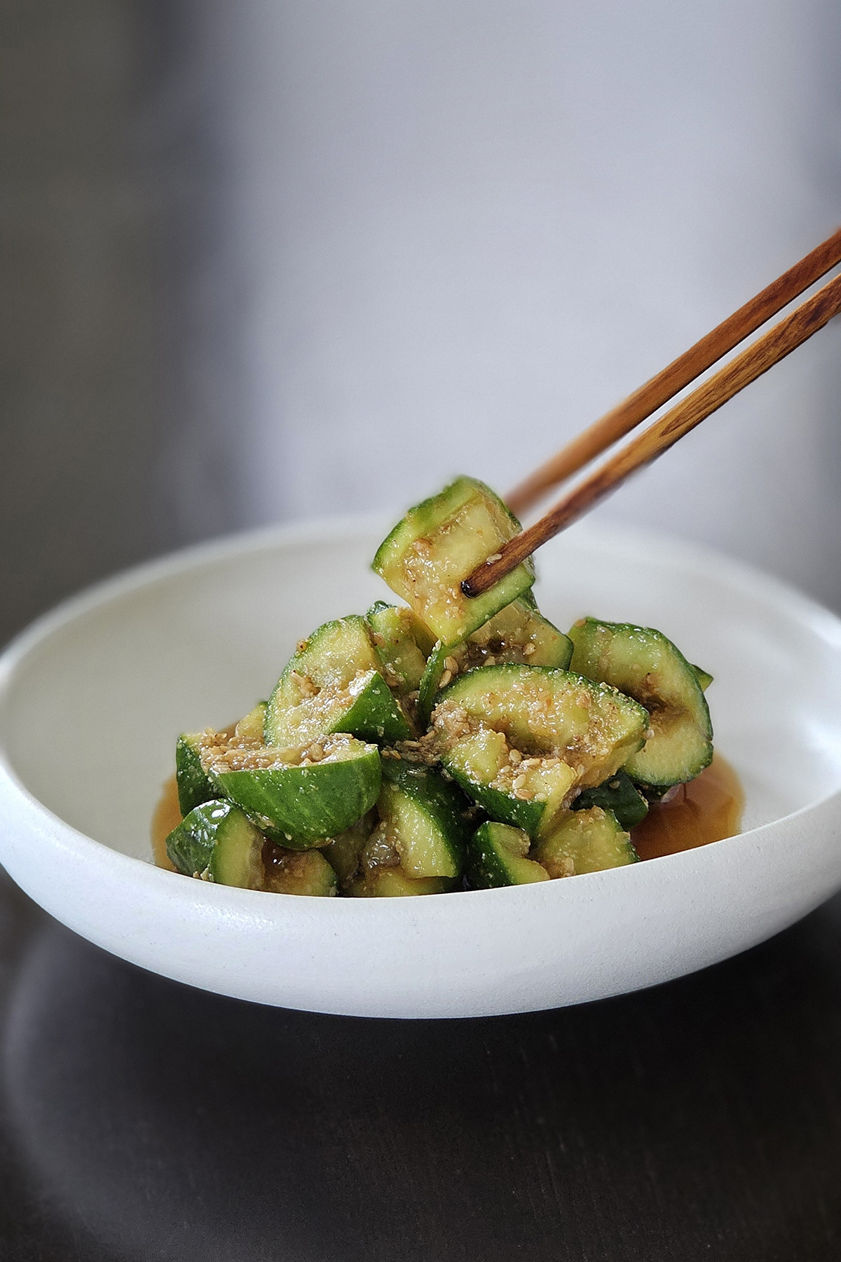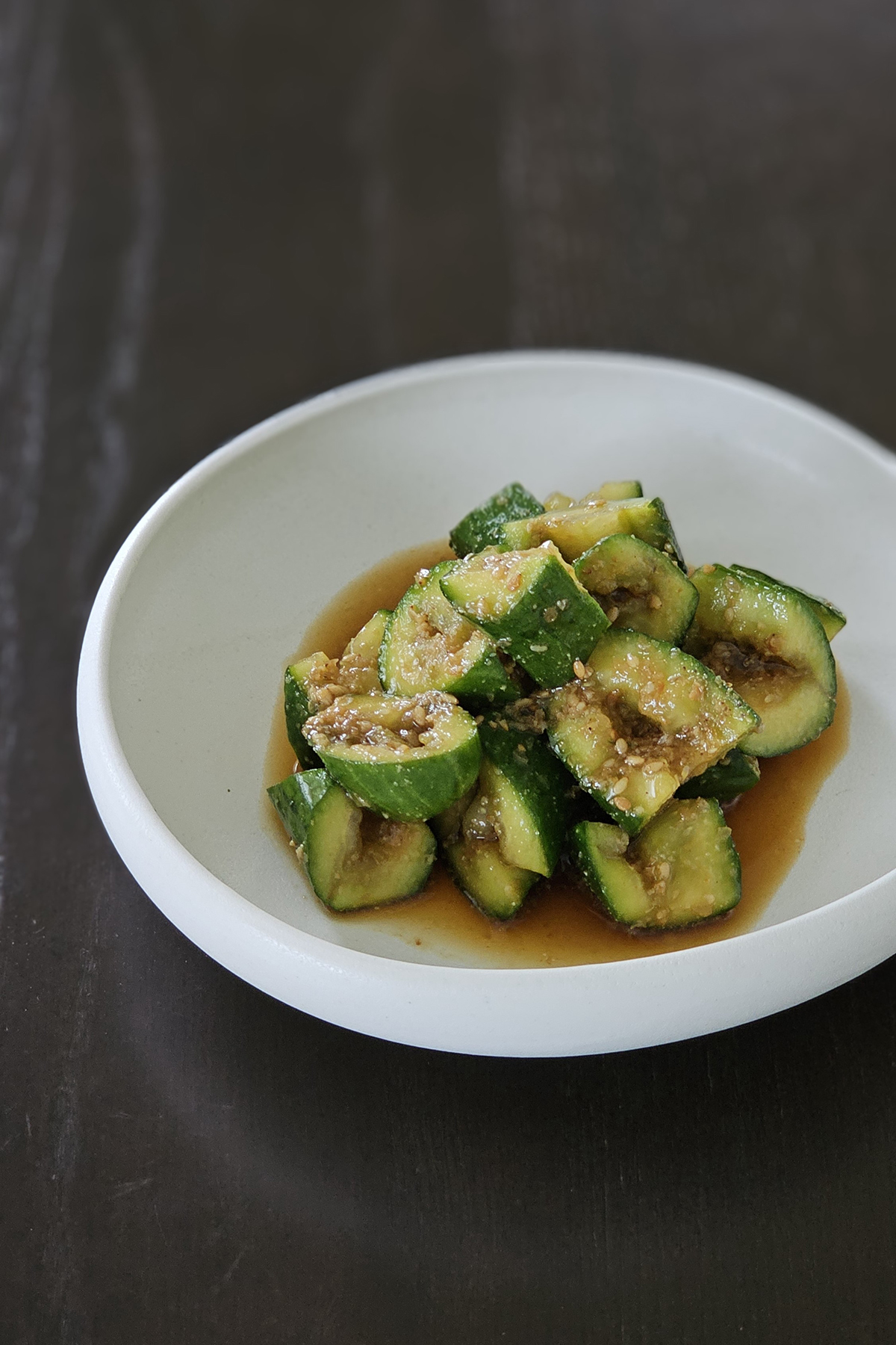 By doing that, the core of the cucumber is exposed more and as a result, it picks up the sauce better!