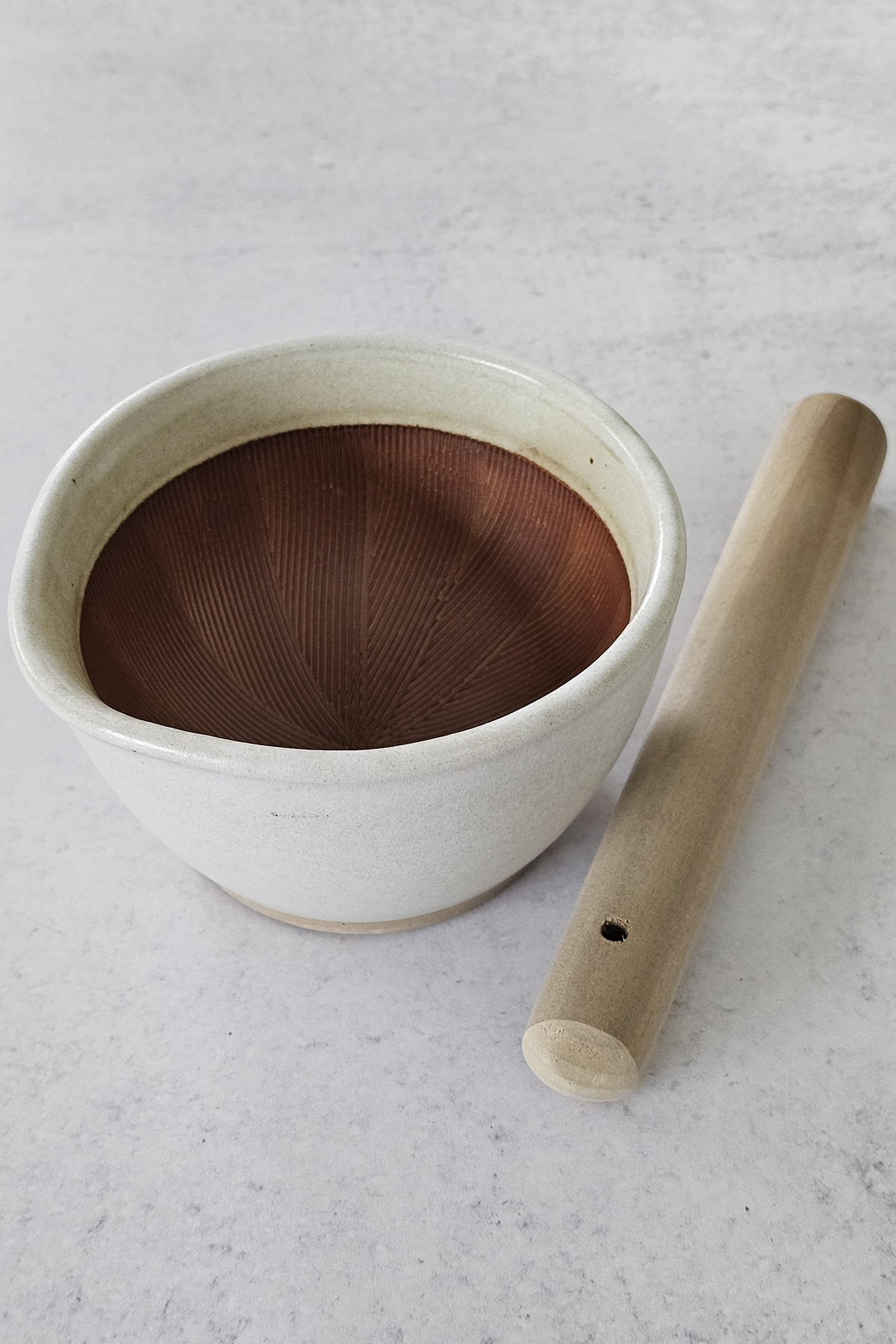 Japanese mortar and pestle is serrated which makes it easy to grind.