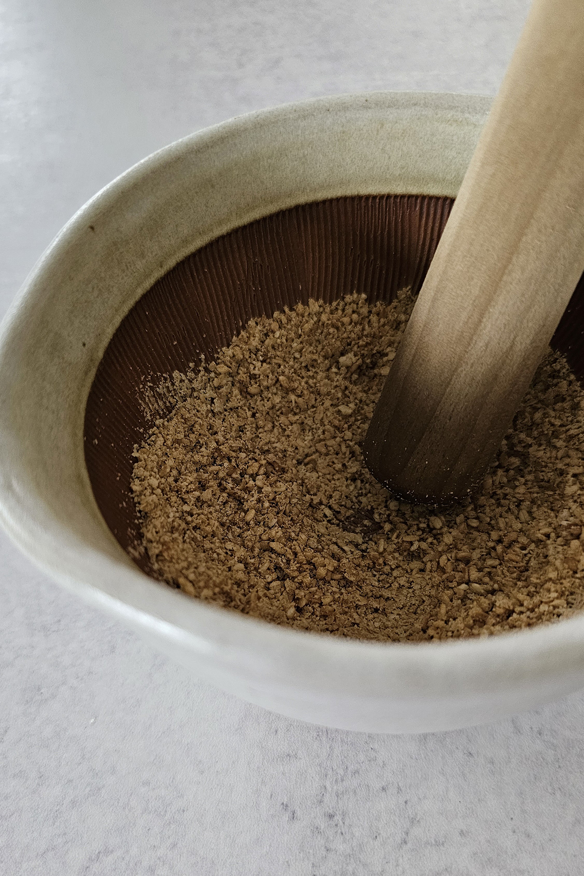 - Grind toasted sesame seeds (optional): Use Japanese mortar & pestle (or regular mortar & pestle.) Place toasted sesame seeds and gently grind until the sesame seeds are partially ground. Set it aside.