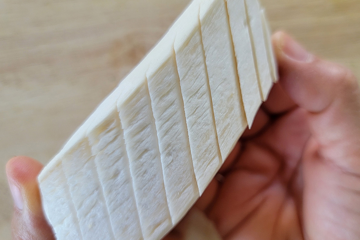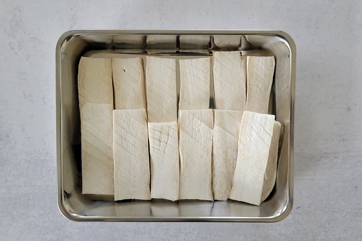 Next, slice them lengthwise into 0.3-0.5 in (8.5 -10 mm) thickness rectangles. Also, trim the sides if you like.