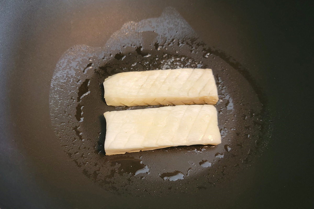 3. Cook the mushrooms. Heat up a frying pan at medium to medium high heat (non-stick surface would be recommended for preventing from sticking.) Pour neutral oil and cook the mushrooms about 2-3 minutes on each side until golden brown. Try not to move them too much for better coloring.