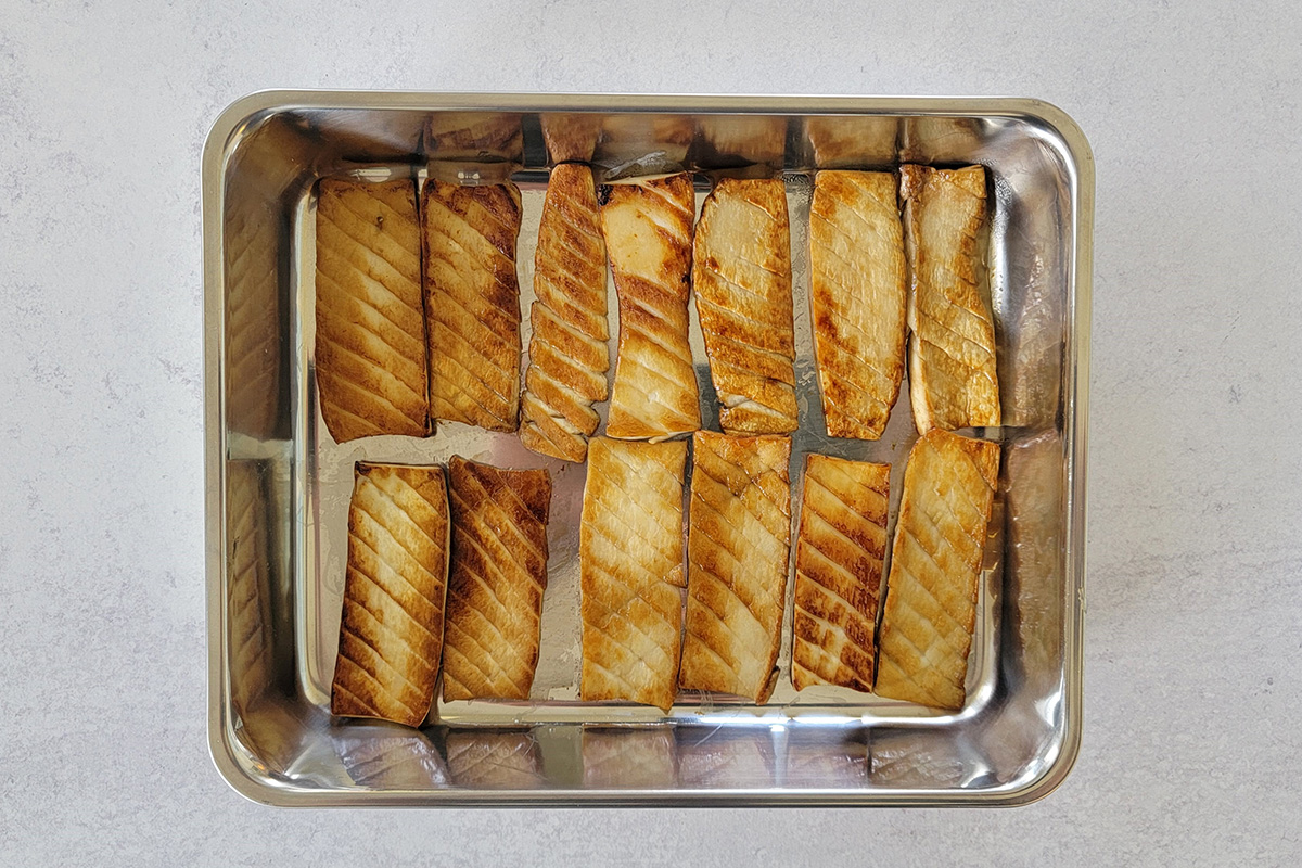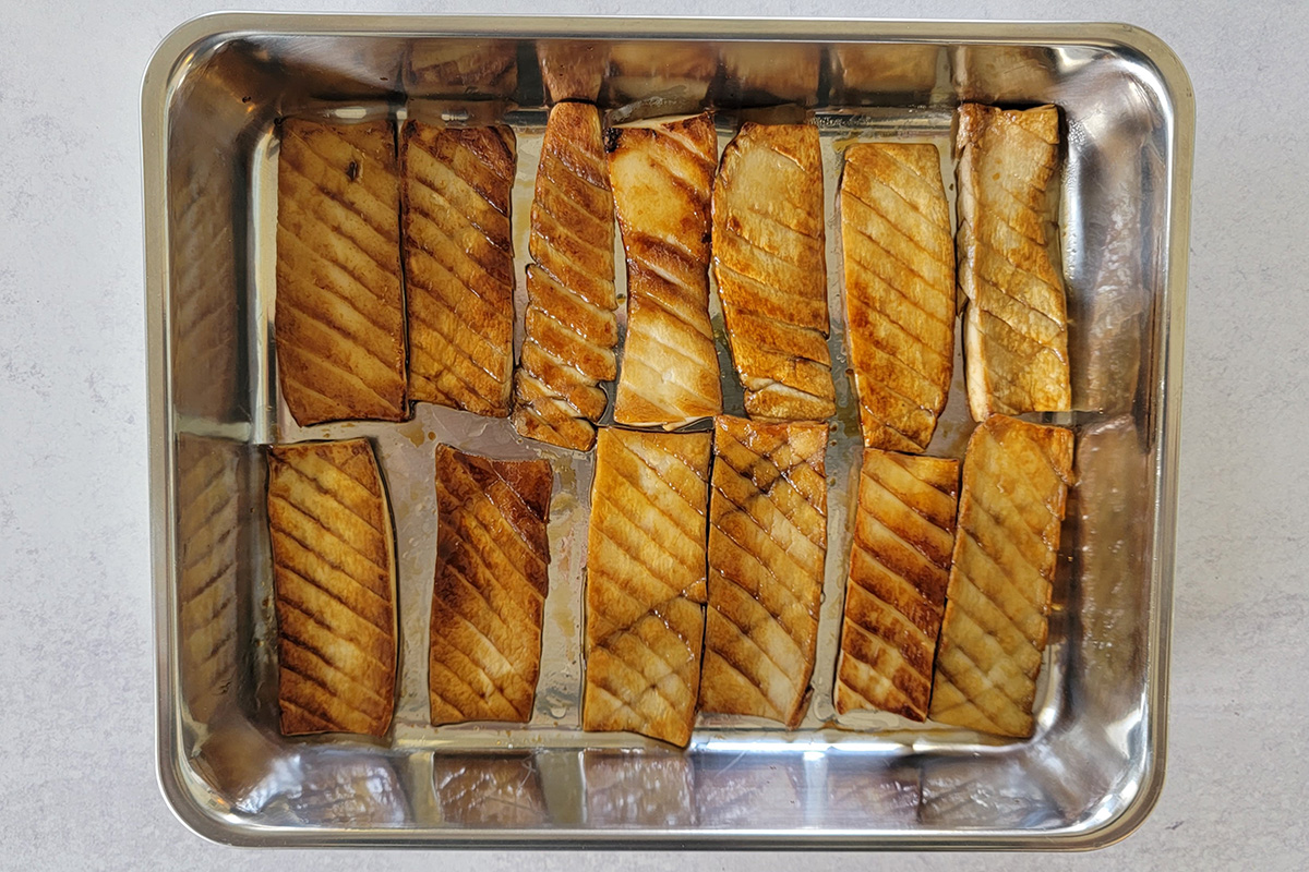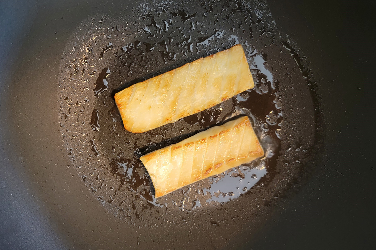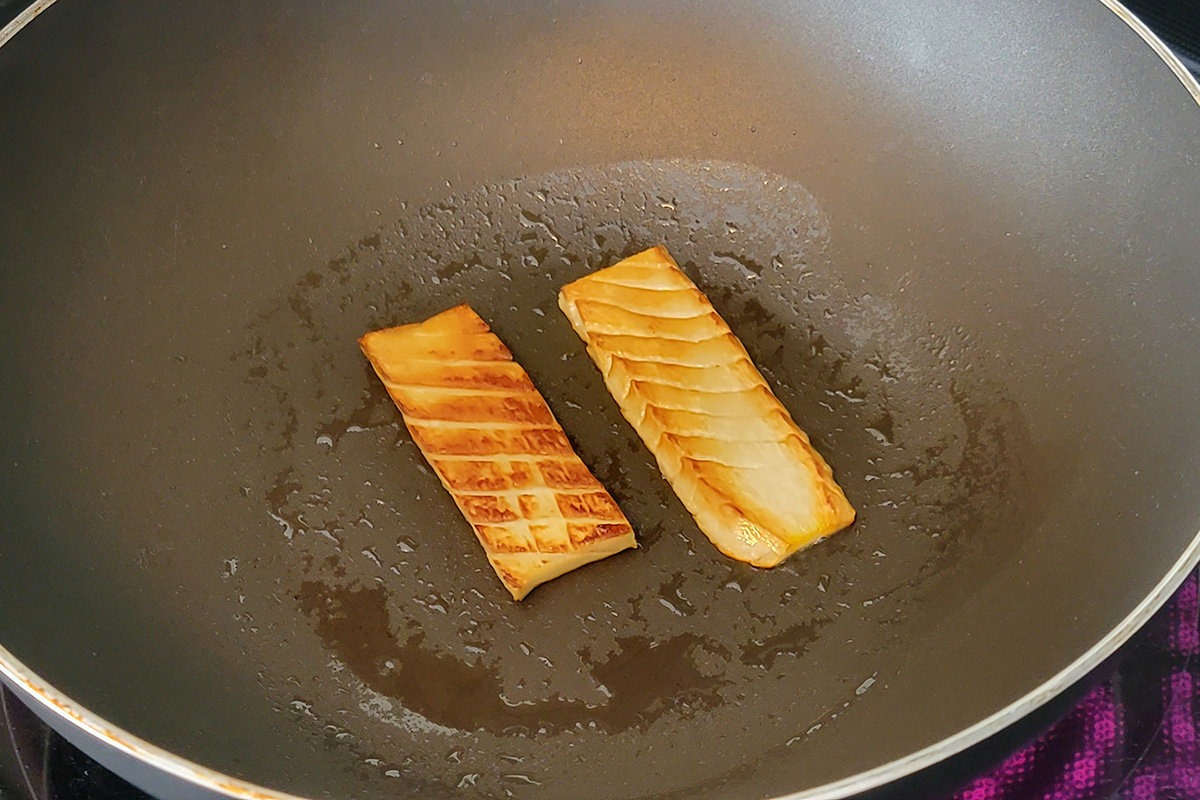 - When cooking, get a good grill mark by not moving too much. This is important for the visual effect of the “fish.”
