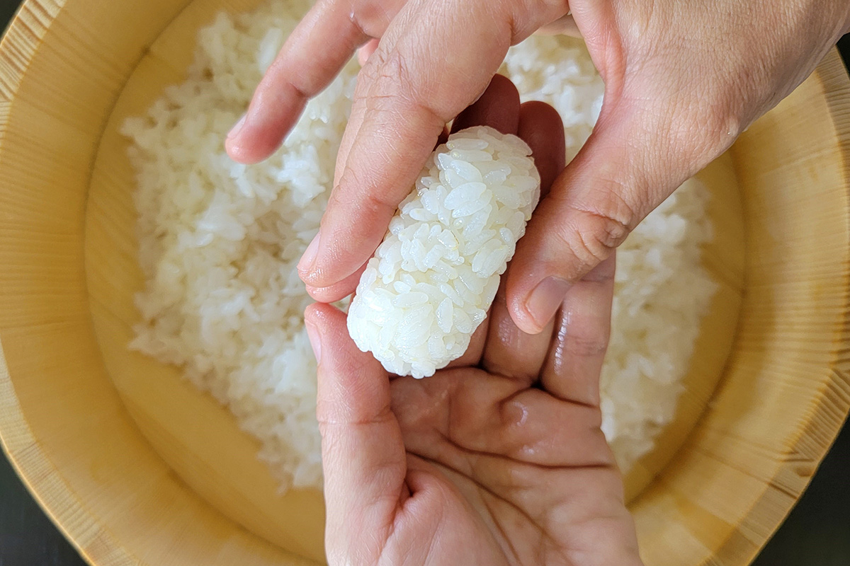 4. Once the sumeshi is done (it should be cooled down to resembling the body temperature), start assembling. Damp your hands and grab a small amount of rice in one hand. Toss and roll gently to form an oval shape (don’t squeeze!)