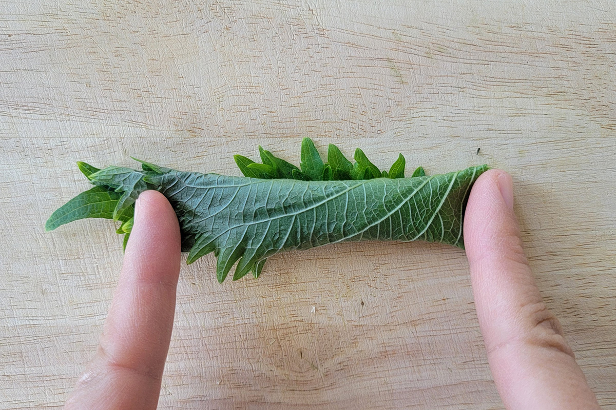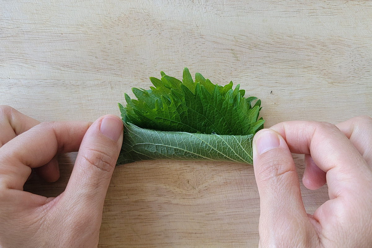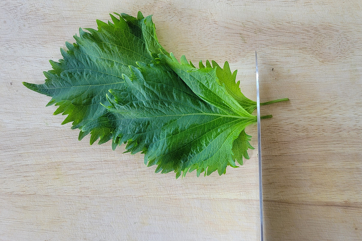 5. Right before serving, prepare shiso leaves. Clean the leaves under running water and gently pat dry with a towel. Cut off the stem at the bottom.