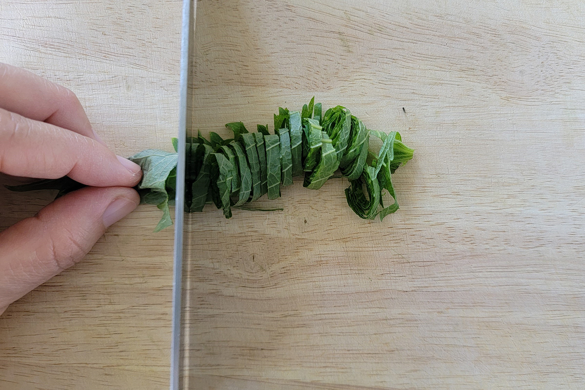Roll all the leaves together (like making a sushi roll) and slice them thinly.