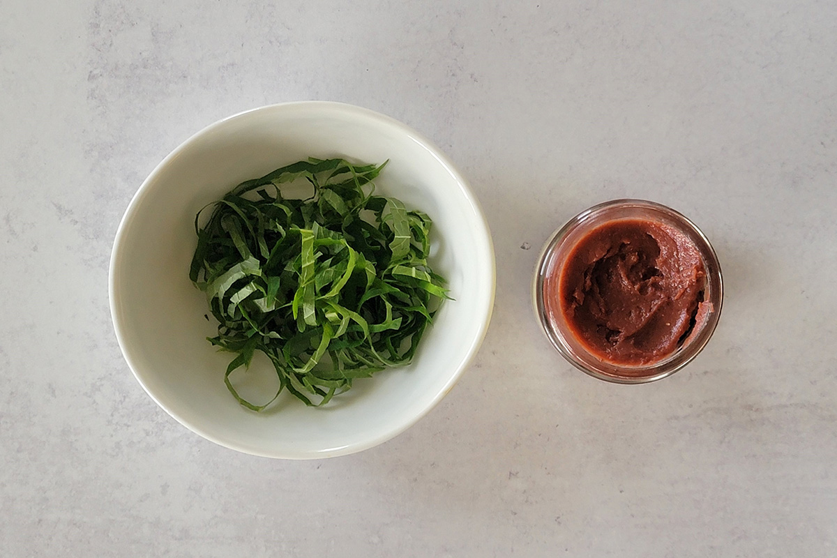 - Right before serving, prepare shiso leaves. Clean the leaves under running water and gently pat dry with a towel. Cut off the stem at the bottom. Roll all the leaves together (like making a sushi roll) and slice them thinly. To serve. topit with a pinch of thinly sliced shiso leaves and a tiny amount of neri ume (about 1/2 tsp for each nigiri.)