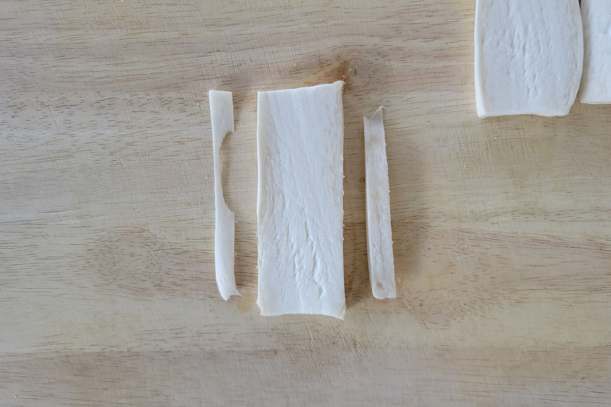 2. While rice is cooking, start preparing the king oyster mushroom “fish.” Trim off the top and the bottom of the mushrooms to make into about 4 in (10 cm) length.