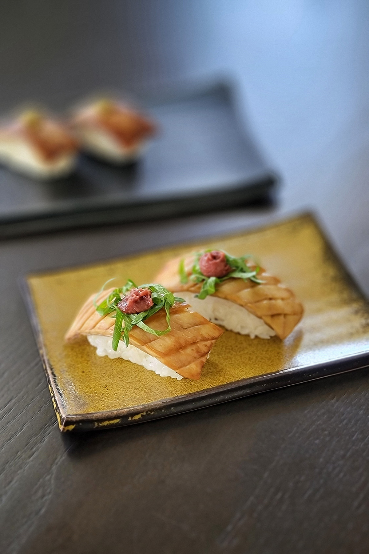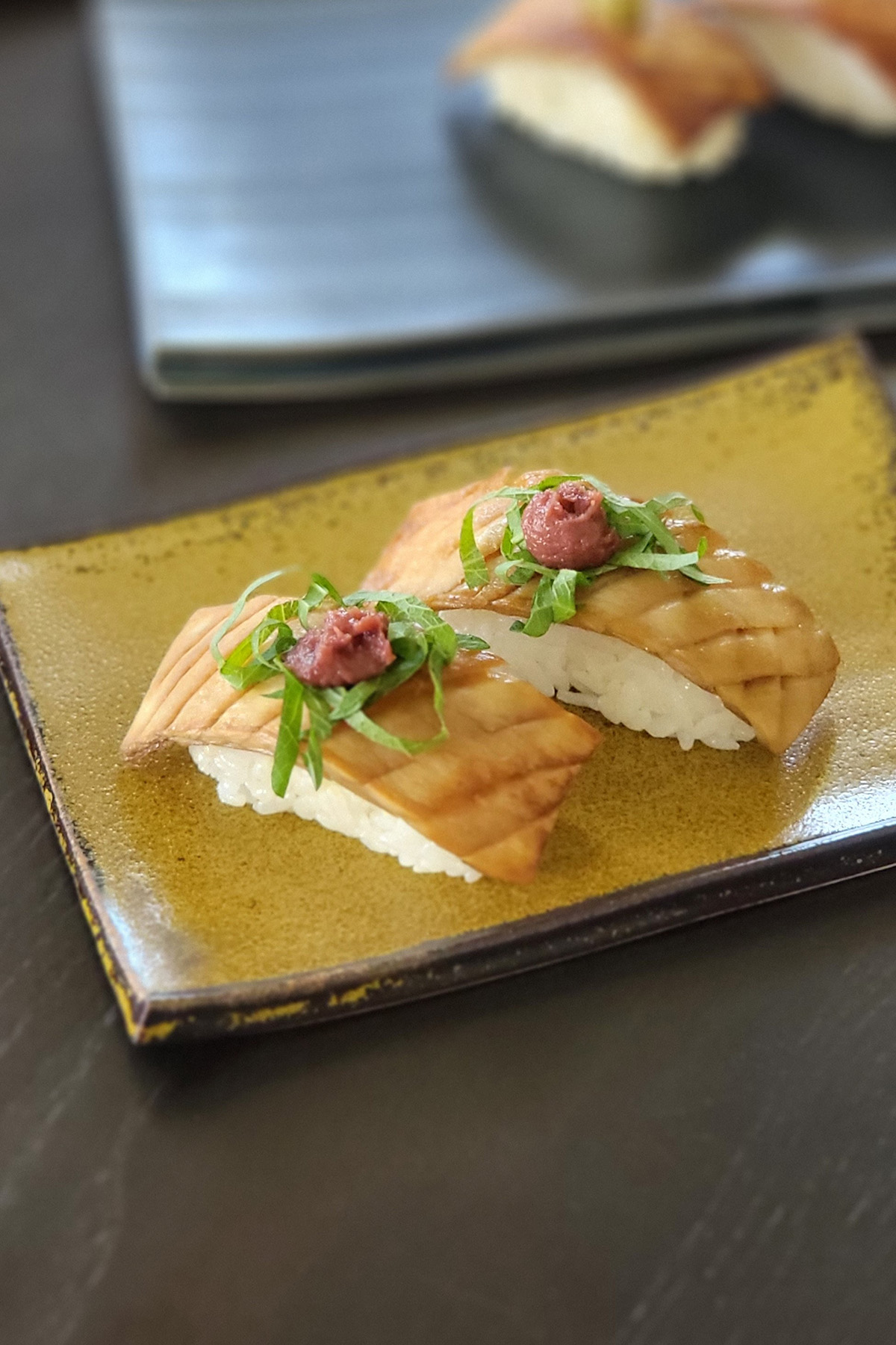 To serve. top it with a pinch of thinly sliced shiso leaves and a tiny amount of neri ume (about 1/2 tsp for each nigiri.)