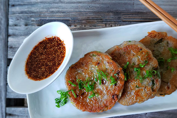 - Heat up a frying pan at medium high heat. Pour 1 tsp neutral oil and add a half of the potato mixture. Spread out the mixture into an 8-inch round and cook for 3-4 minutes. Flip it and flat it out. Cook for another 3-4 minutes until golden crispy. Swirl in extra toasted sesame oil right before removing the pancake from the pan. Repeat the process.