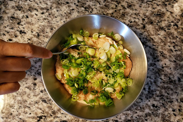 - Transfer the drained grated potatoes to another bowl and set aside. You should see the liquid from potatoes with the white substance left at the bottom of the bowl (or radish grater) from step 1. Carefully and slowly drain only the liquid part. After draining, it should leave you only with the white substance settled at the bottom which is potato starch. Scoop it and add to the grated potatoes then add the remaining ingredients; scallions, toasted sesame oil, salt, and black pepper. Mix well and set aside.