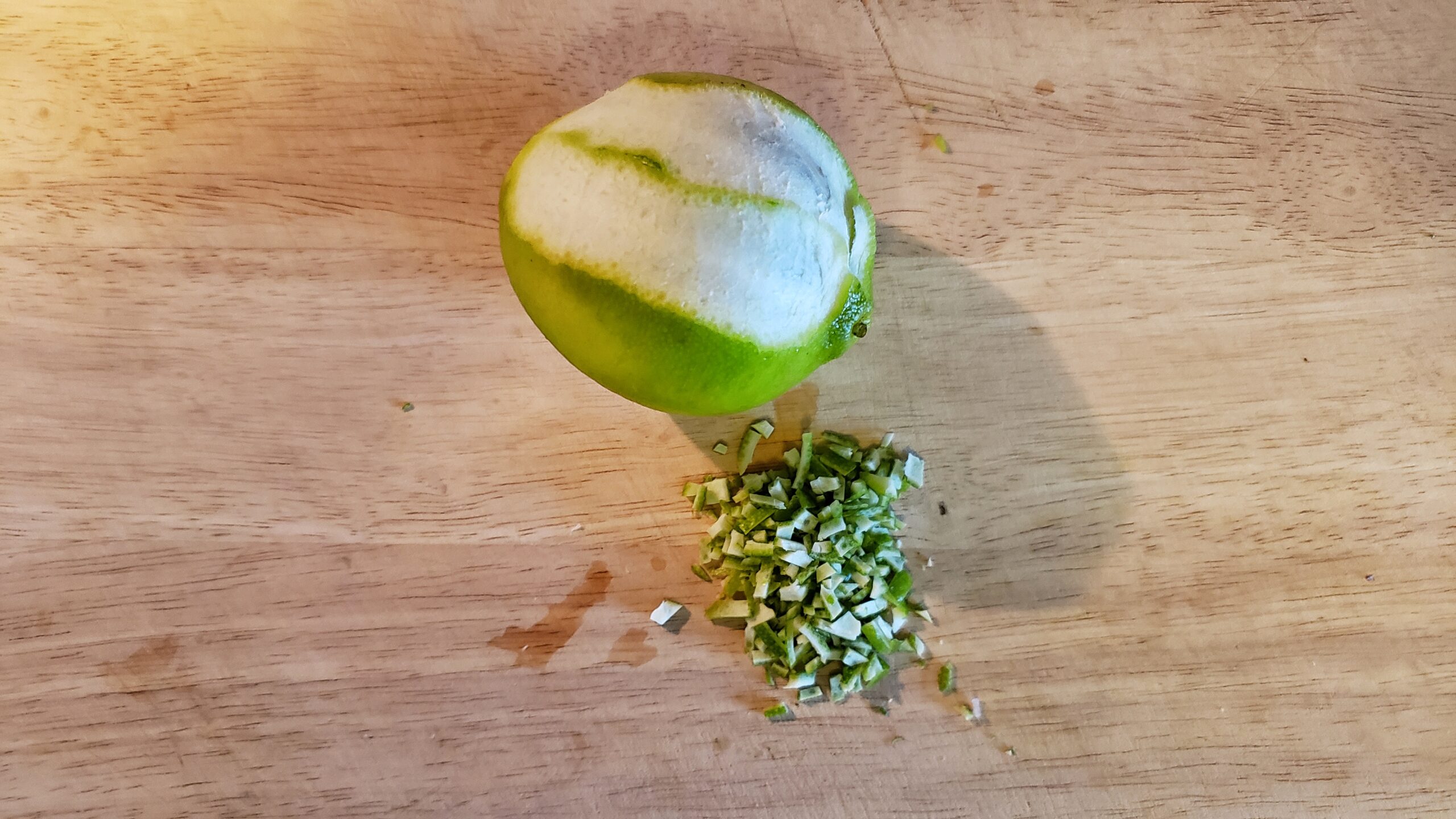 - For the lime, use a knife to peel off a few strips of lime rind. Cut into thin strips and mince it. About 1 tsp of minced lime rind will be good for the recipe (2 servings.) Save the rest for squeezing fresh lime juice for right before serving. Set those aside.