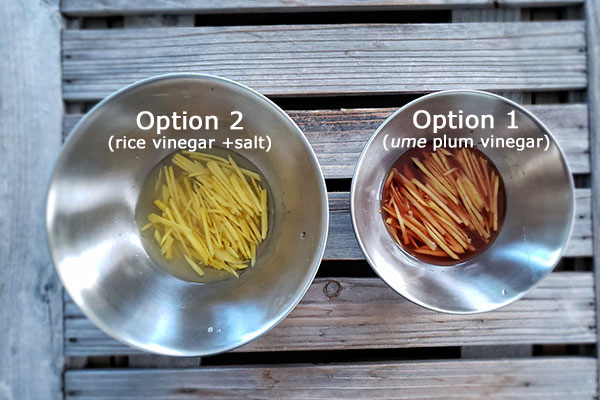 I tested this for those who have no access to beni-shoga. The goal is to make salty and acidic taste ginger strips so you have two options.