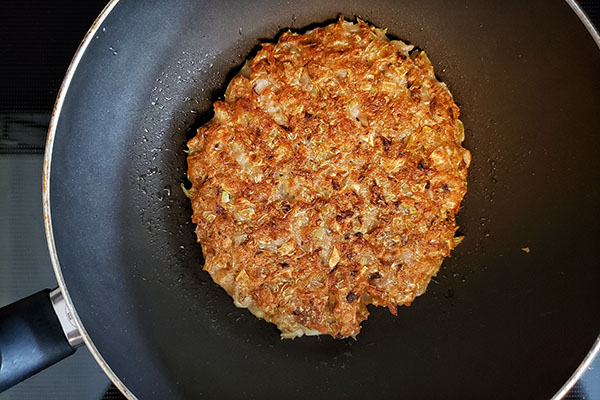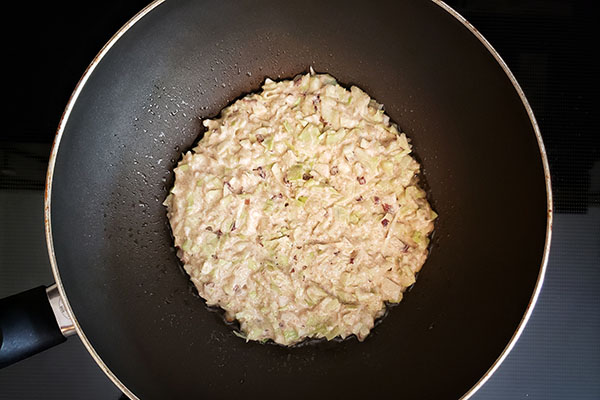 - Heat up a non-stick pan or something similar at medium heat. Pour 2 tsp neutral oil and add a 1/4 of the batter. Spread out to make about 1-inch-thick round. Cook for 8-10 minutes. Watch the heat to avoid burning.