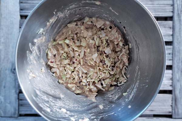 - Make the batter. In a large bowl, add spelt flour and pour water. Use a whisk to mix until seeing no lumps. Next, add grated mountain yam (optional), dulse flakes and salt. Mix until blended. Lastly, add cabbage to the batter. Mix again until all ingredients are combined. The batter should not be too loose nor too thick (similar to waffle batter.)