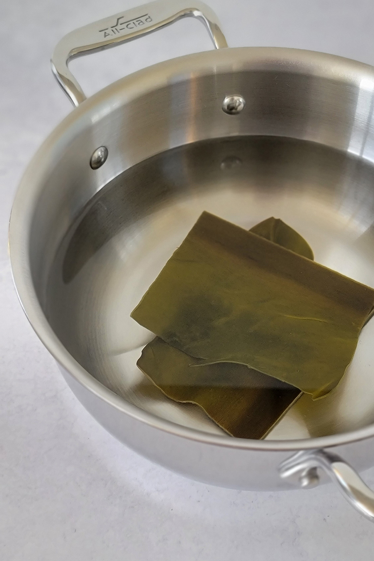 - In a medium size pot, combine water and dried kombu. Let it soak for 30 minutes.