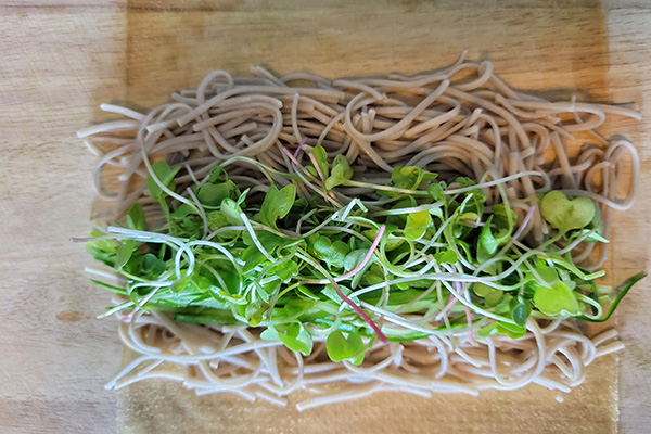 - Assemble. Using VEGHEET: Place a sheet of VEGHEET on a cutting board. Spray water (or apply water with pastry brush) to damp the sheet. Let it stand for 30 seconds. Portion each ingredient into 4 to 5 equal parts. Place the seasoned soba, cucumber, and radish sprouts. Roll it tight (like making sushi) and leave the last 0.75 inch (2 cm) at the top. Apply a dap of water at the top end then roll it to seal. Leave it with the sealed side down and set aside. Repeat the process. Using sushi nori: Place a nori sheet on a bamboo rolling mat (or cutting board if you don’t have the mat.) Portion each ingredient into 4 to 5 equal parts. Place the seasoned soba, cucumber, and radish sprouts. Roll it tight. Leave it with the sealed side down and set aside. Repeat the process.