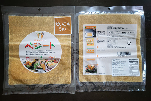 One package contains 4-5 sheets (depending on the flavor) made with real vegetable and agar-agar. Yes, only two ingredients! The one I used for this recipe is the daikon radish flavor.