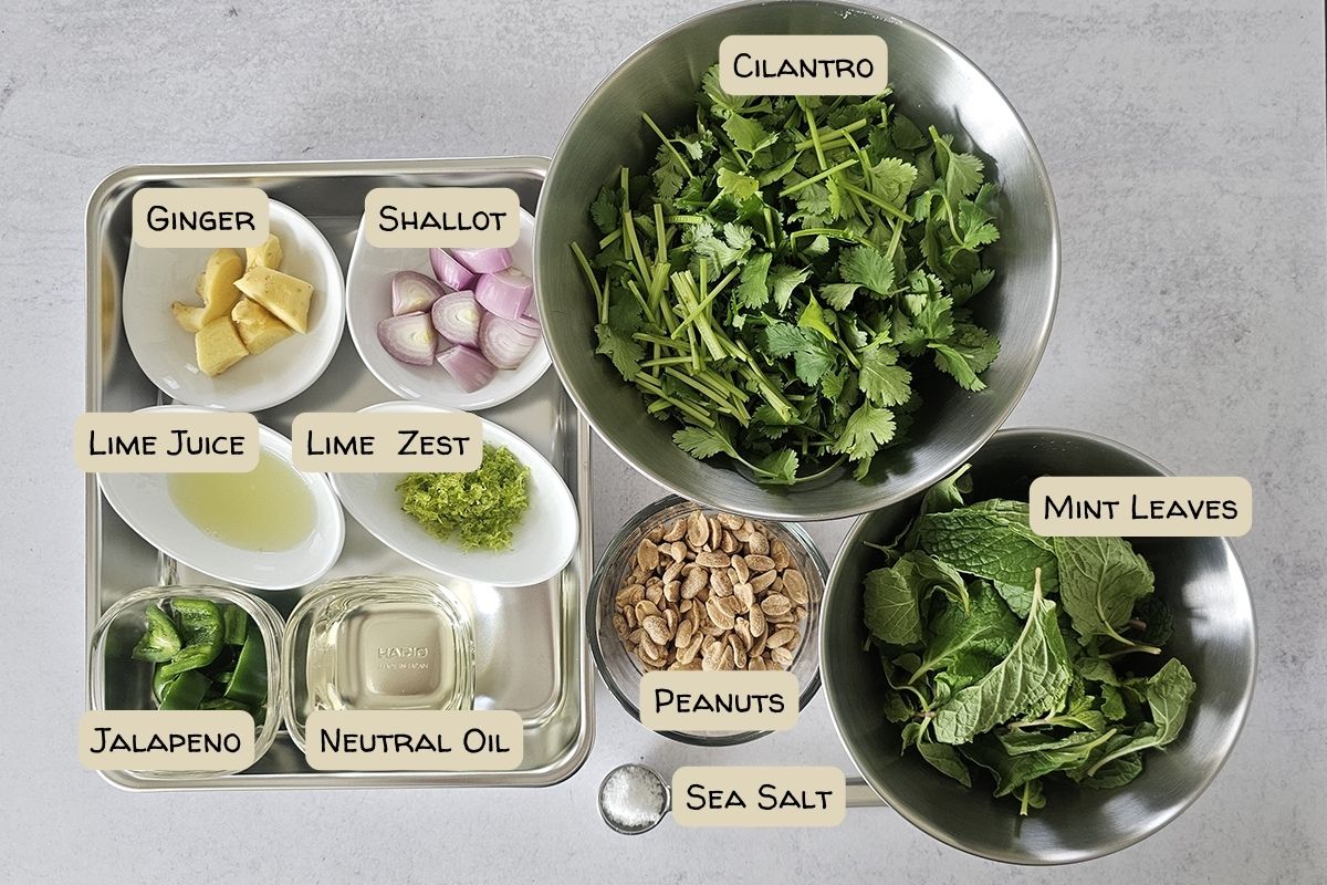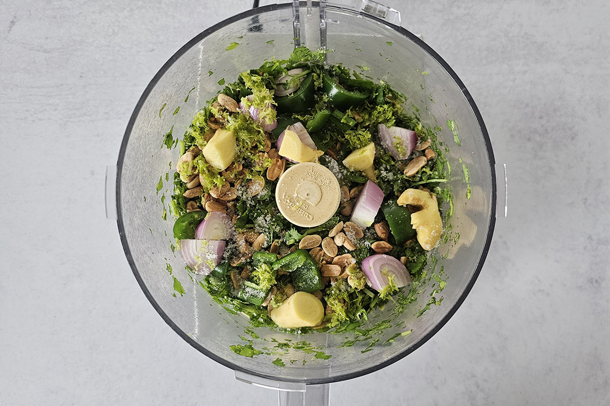 • Next, add the roasted peanuts, jalapeno, shallots, ginger, lime zest, lime juice, and sea salt. Pulse again until finely chopped. Scrape the side if necessary.