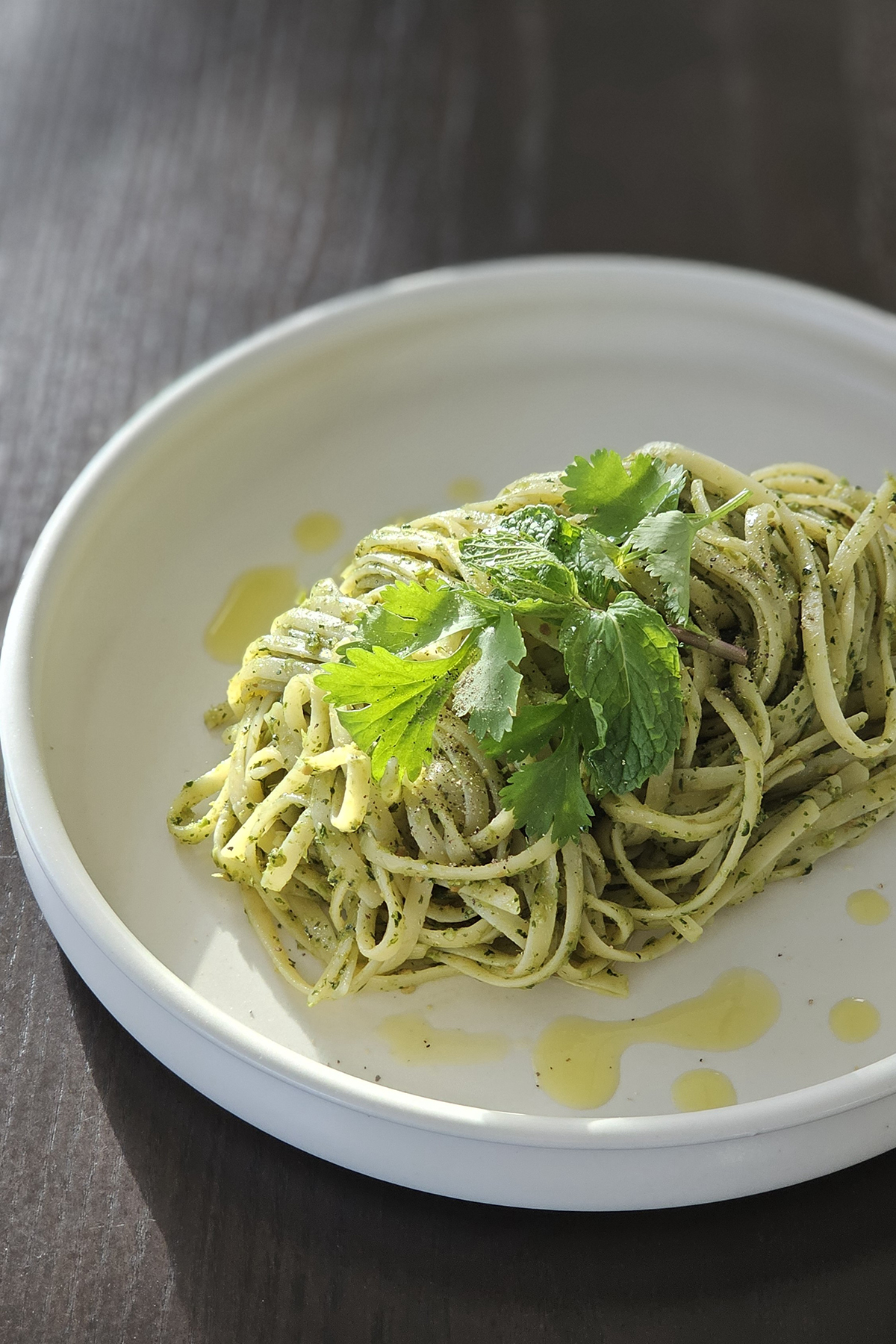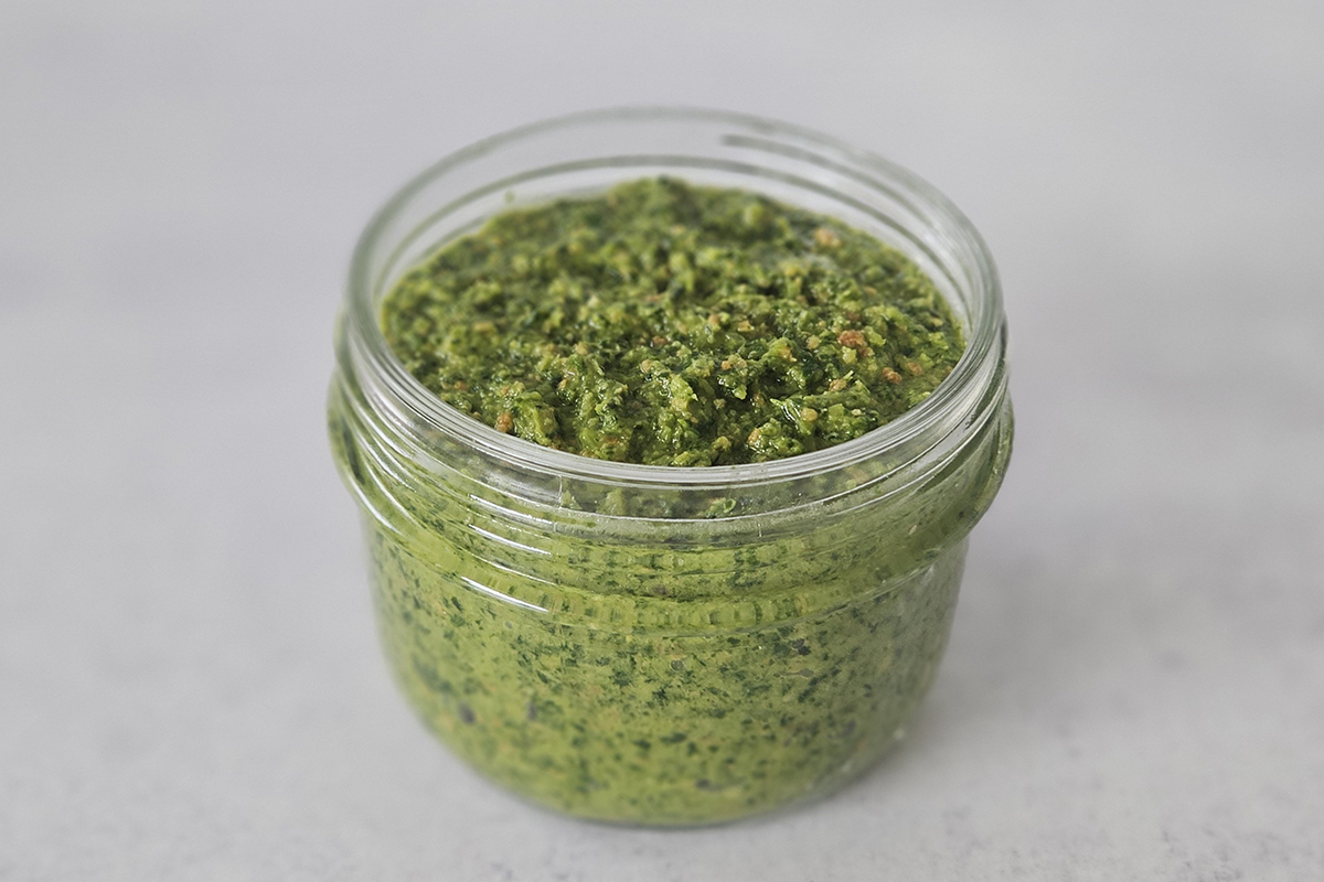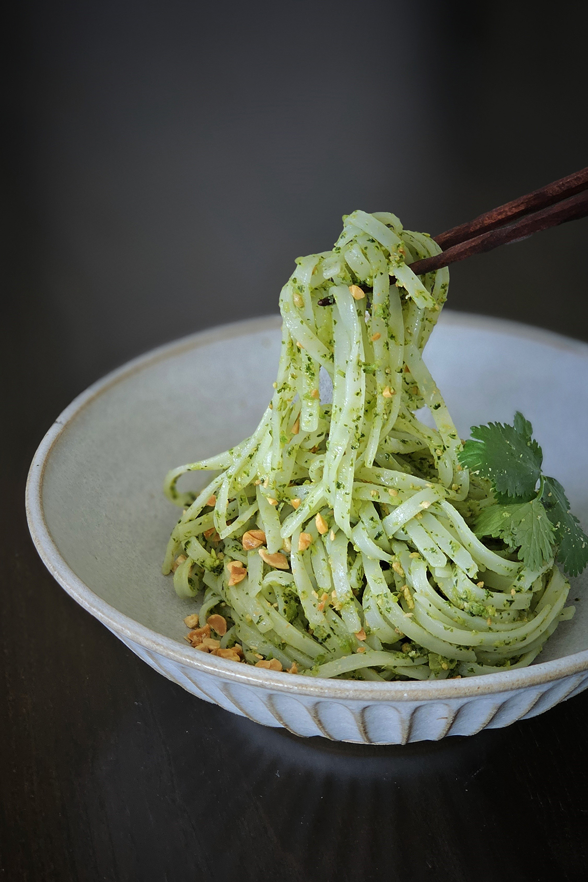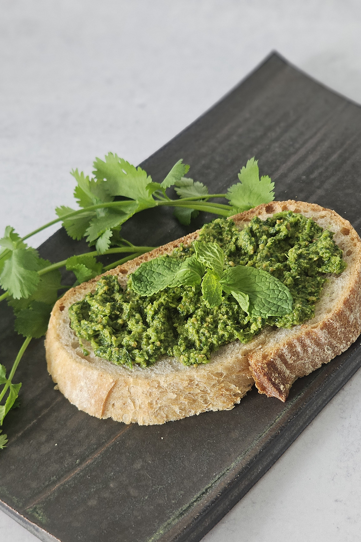 Unlike the traditional Italian pesto, vegan cilantro mint pesto has peanuts to go with the Southeast Asian flavor. Roasted peanuts give a nutty and slightly sweet taste. It’s a great complement to the fresh cilantro and mint.