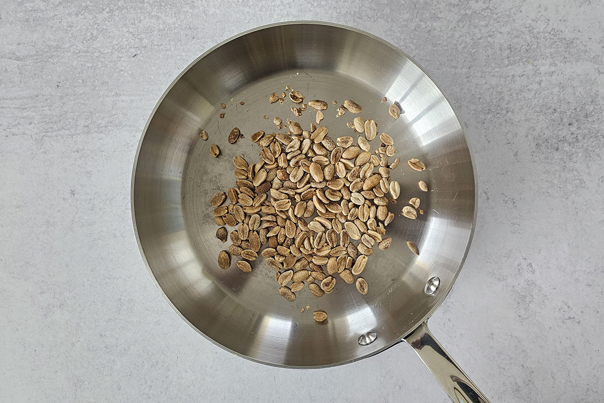 1. Place peanuts (roasted or unroasted) in a frying pan.