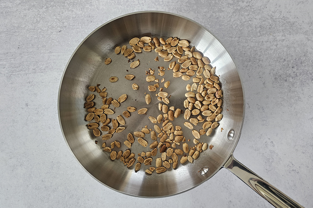 • Place peanuts (roasted or unroasted) in a frying pan. Dry roast over medium heat for about 5-7 minutes until aromatic and lightly browned. Set it aside.