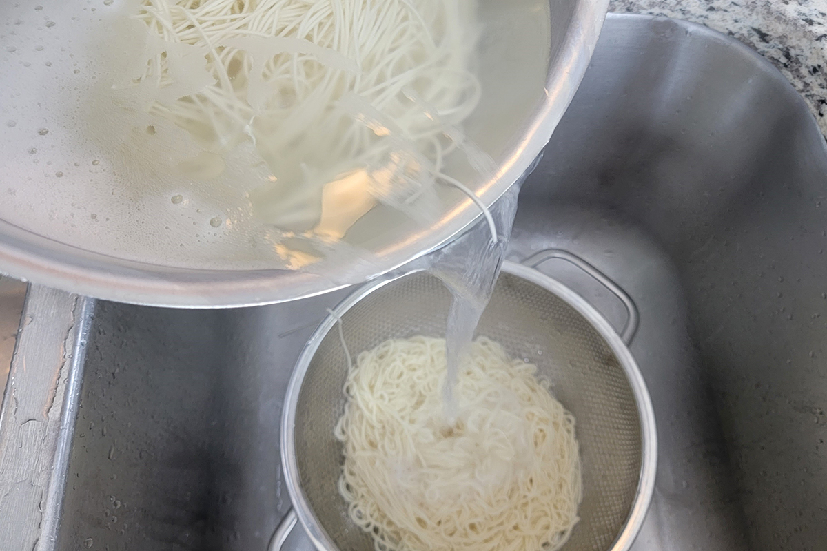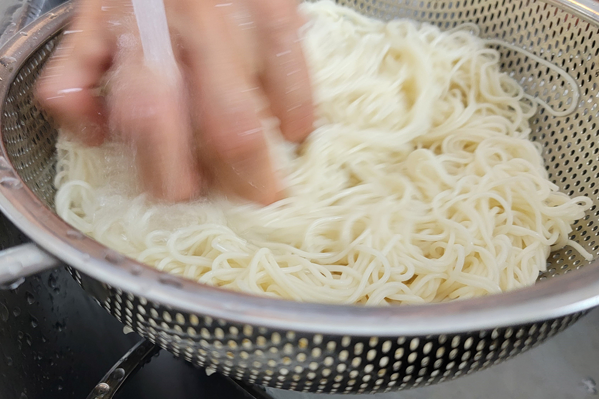 - Use a colander to drain. Immediately rinse with cold running water to remove the starch. Shake off the excess water then transfer the somen noodles to the ice bath to shock them.