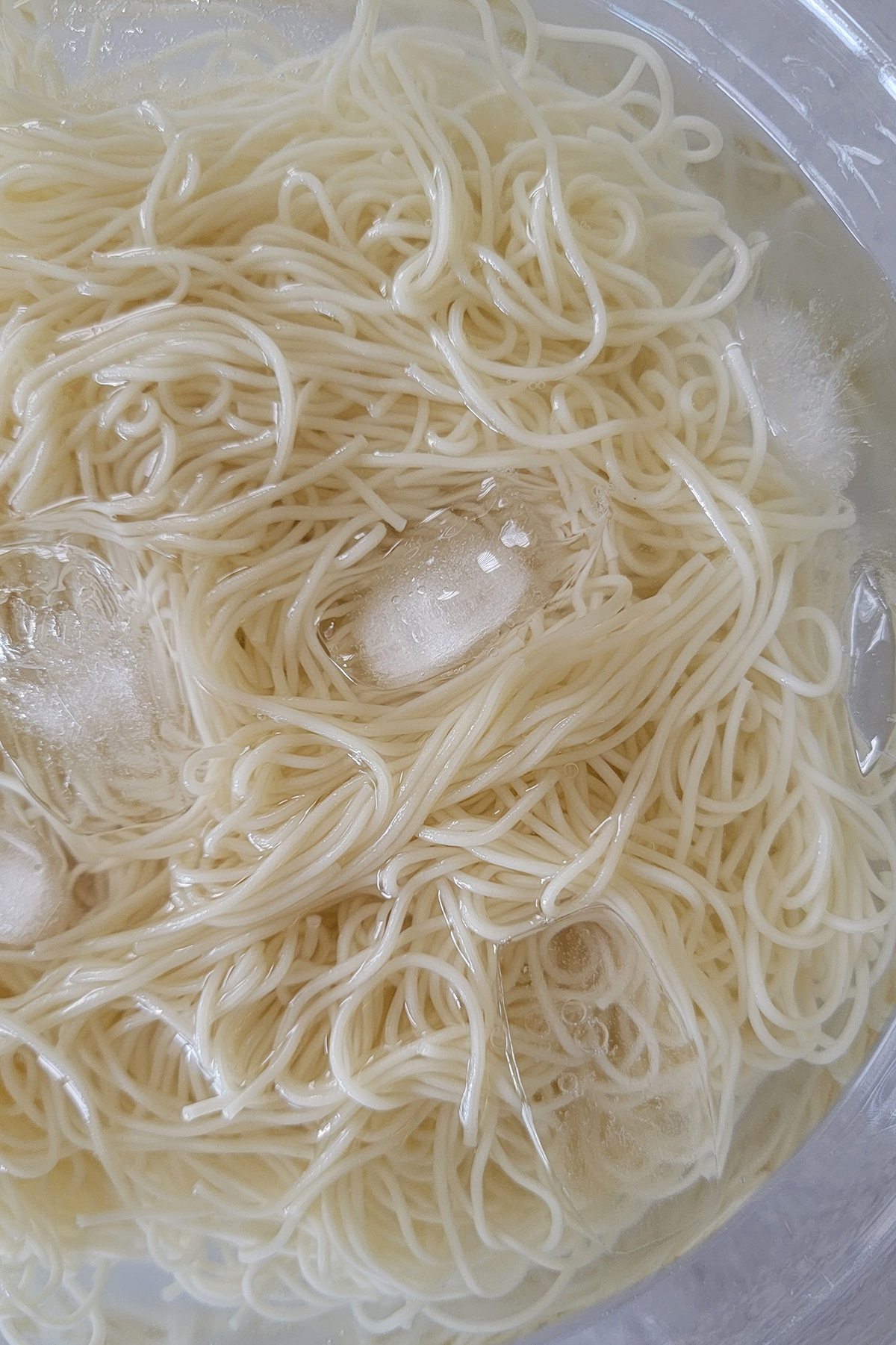 Shake off the excess water then transfer the somen noodles to the ice bath to shock them.