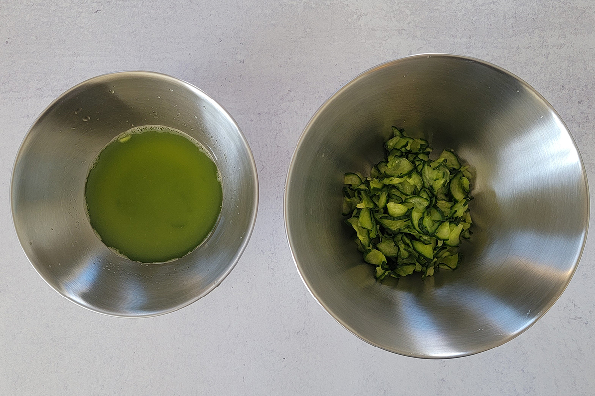 • Next, prepare the cucumber. In a prep bowl, add sliced cucumber. Sprinkle salt and massage gently with hand. Let is stand for 10 minutes then squeeze the cucumber to get rid of the water as much as you can. Transfer to another bowl and set aside.
