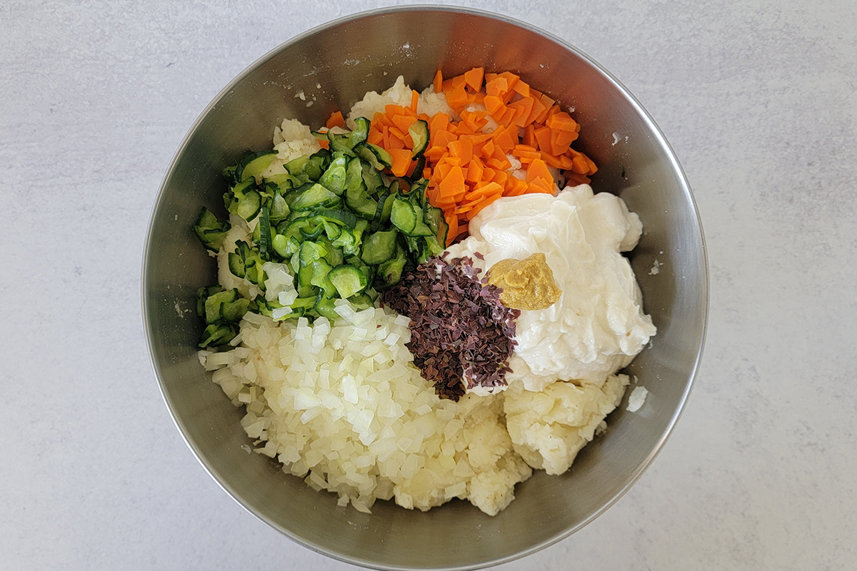 • Once the potatoes and carrots cooled down, start assembling. Into the bowl with the seasoned potatoes, add the carrot, cucumber, onion, vegan mayo, Japanese mustard, and dulse flakes (optional.) Mix well until well combined. Adjust the seasoning with more salt and black pepper if needed.