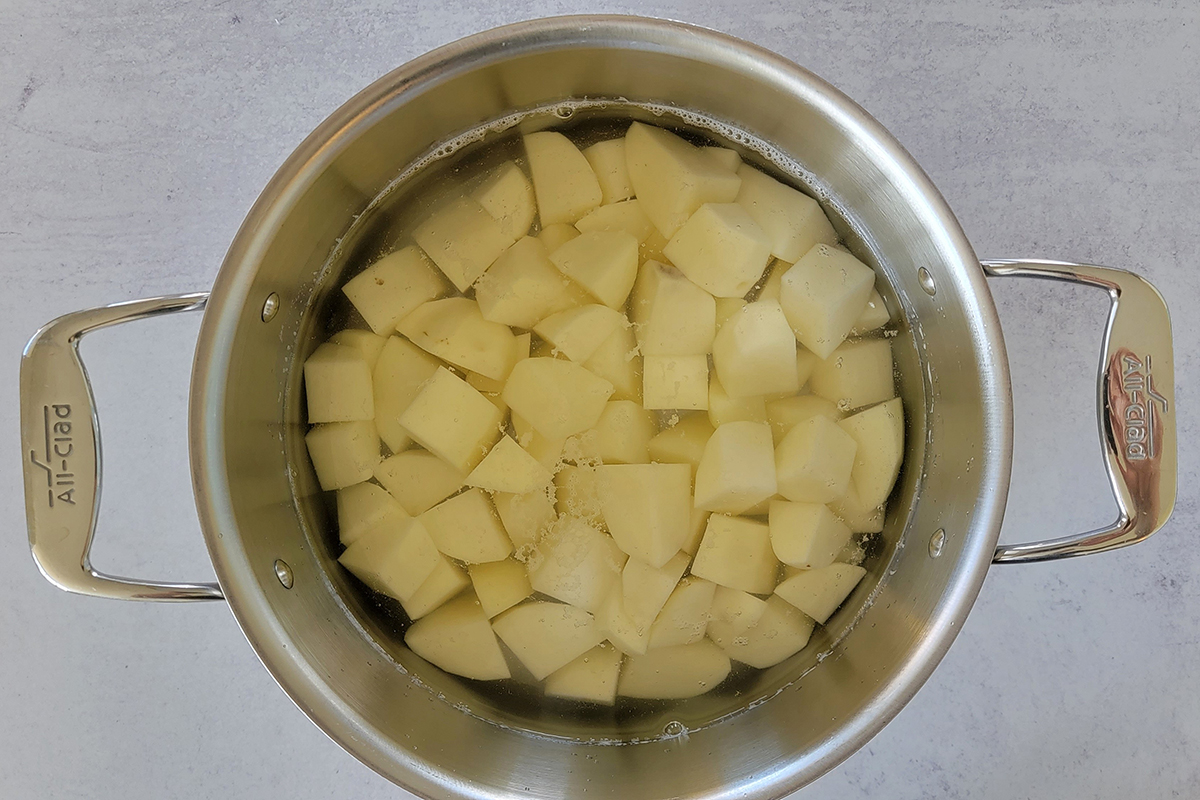 • I boil potatoes after peeled and cut into chunks for faster cooking. As long as you drain well and let it stand to cool down for 10-15 minutes, they don’t get mushy. Make sure to cut into larger chunks so you don’t end up with “potato soup.”
