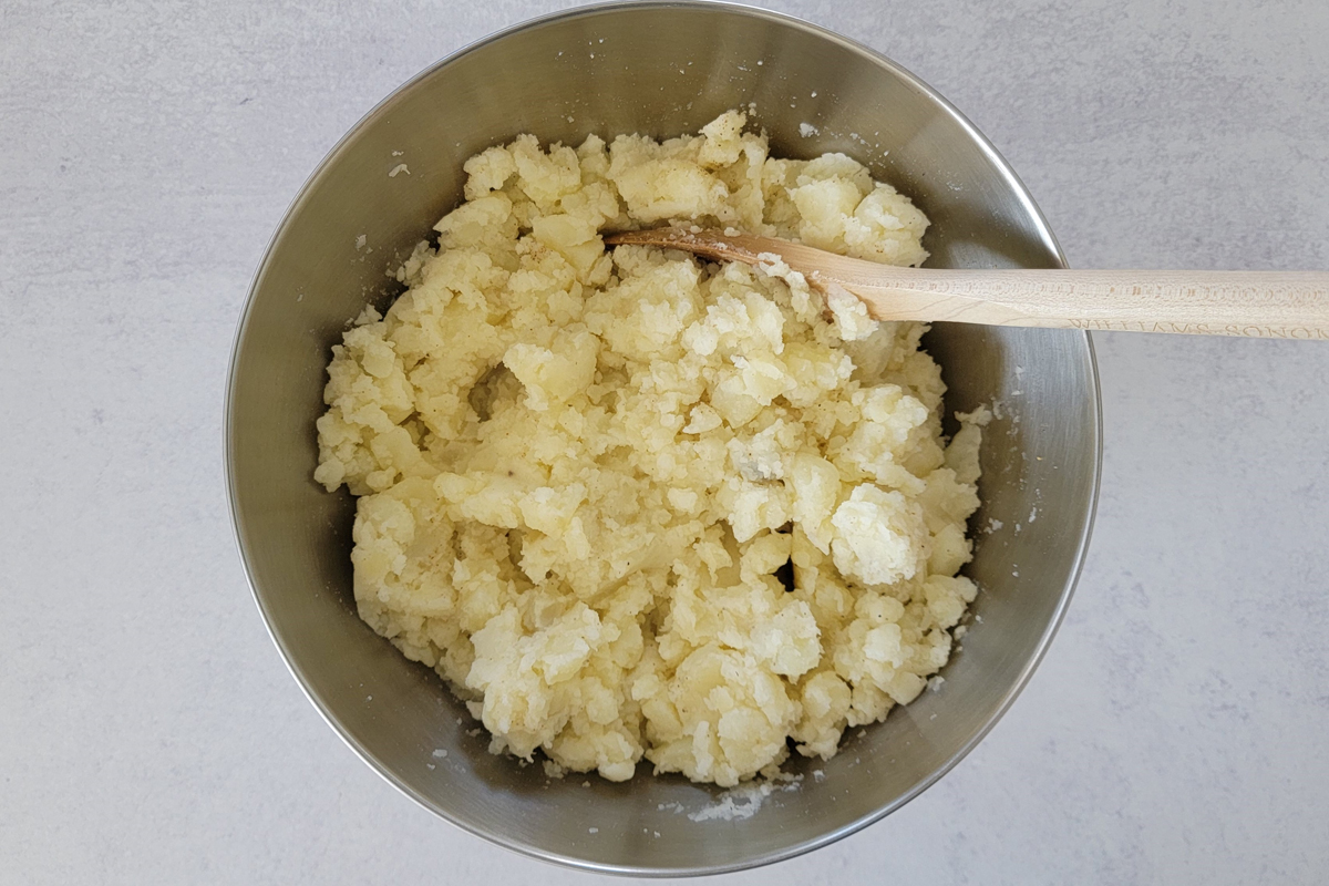 After the potatoes are slightly cooler but still warm, transfer to a large prep bowl and roughly mash them then season with salt and pepper. Don’t over season as you can adjust the seasoning later. Set aside to let it continue to cool down completely.