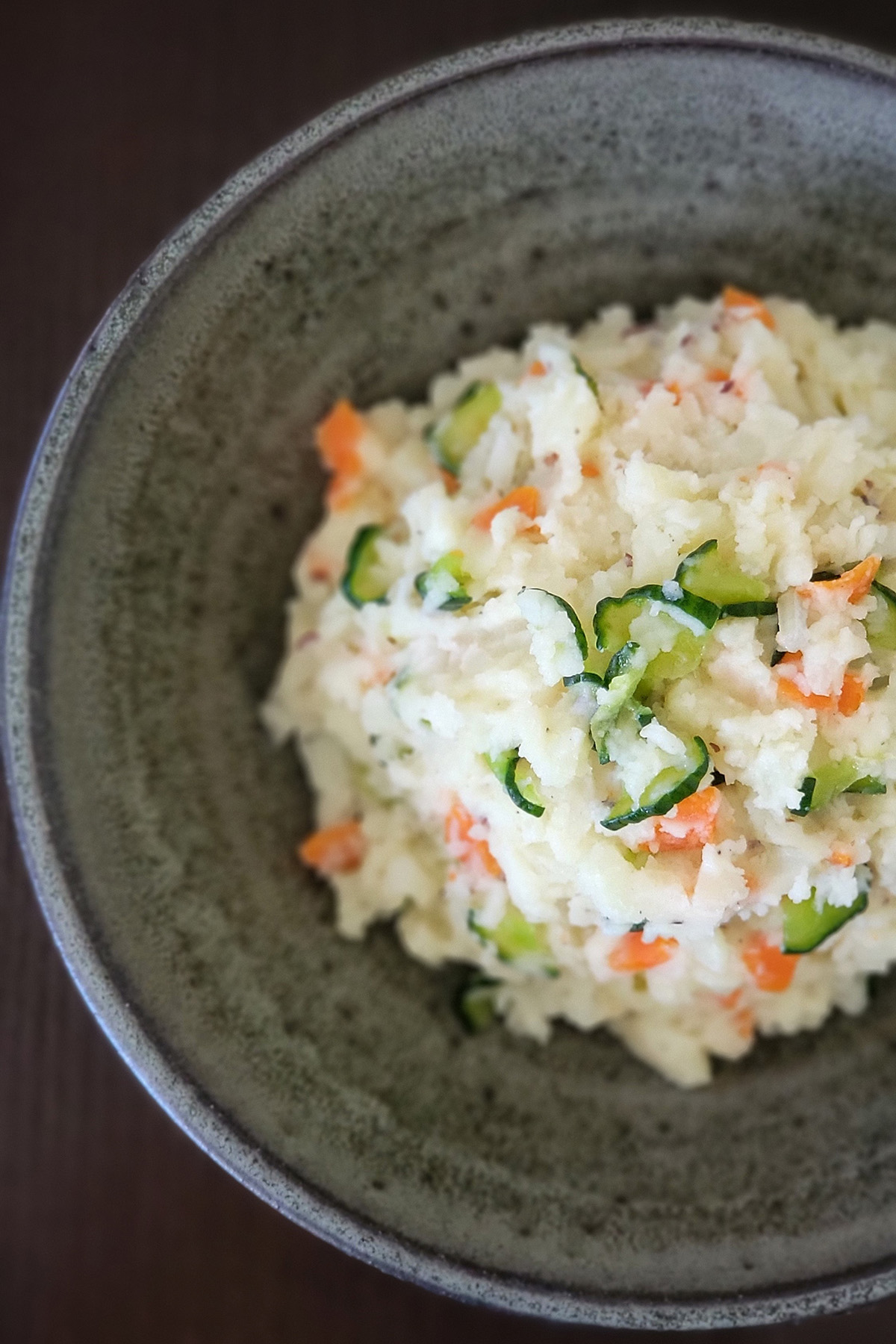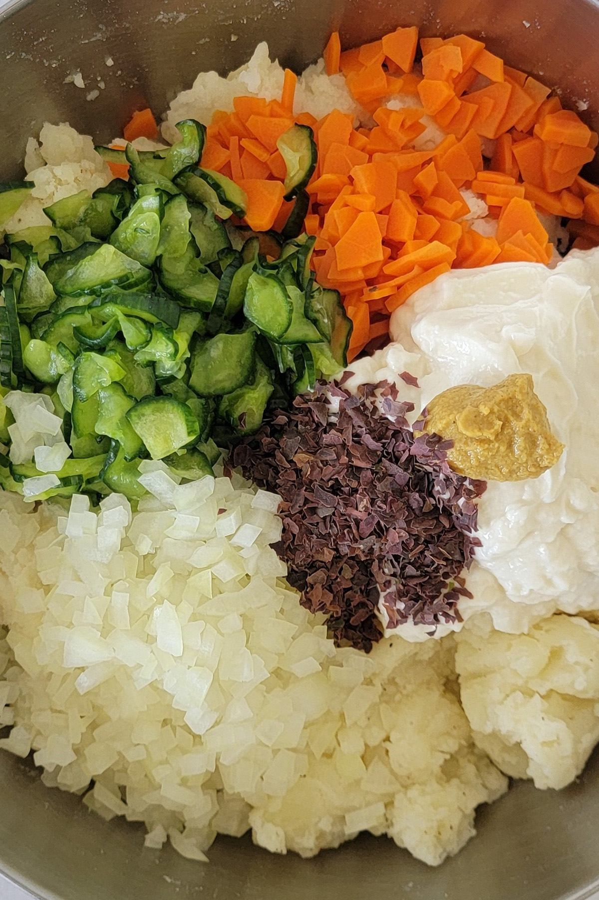 5. Once the potatoes and carrots cooled down, start assembling. Into the bowl with the seasoned potatoes, add the carrot, cucumber, onion, vegan mayo, Japanese mustard, and dulse flakes (optional.) Mix well until well combined. Adjust the seasoning with more salt and black pepper if needed.