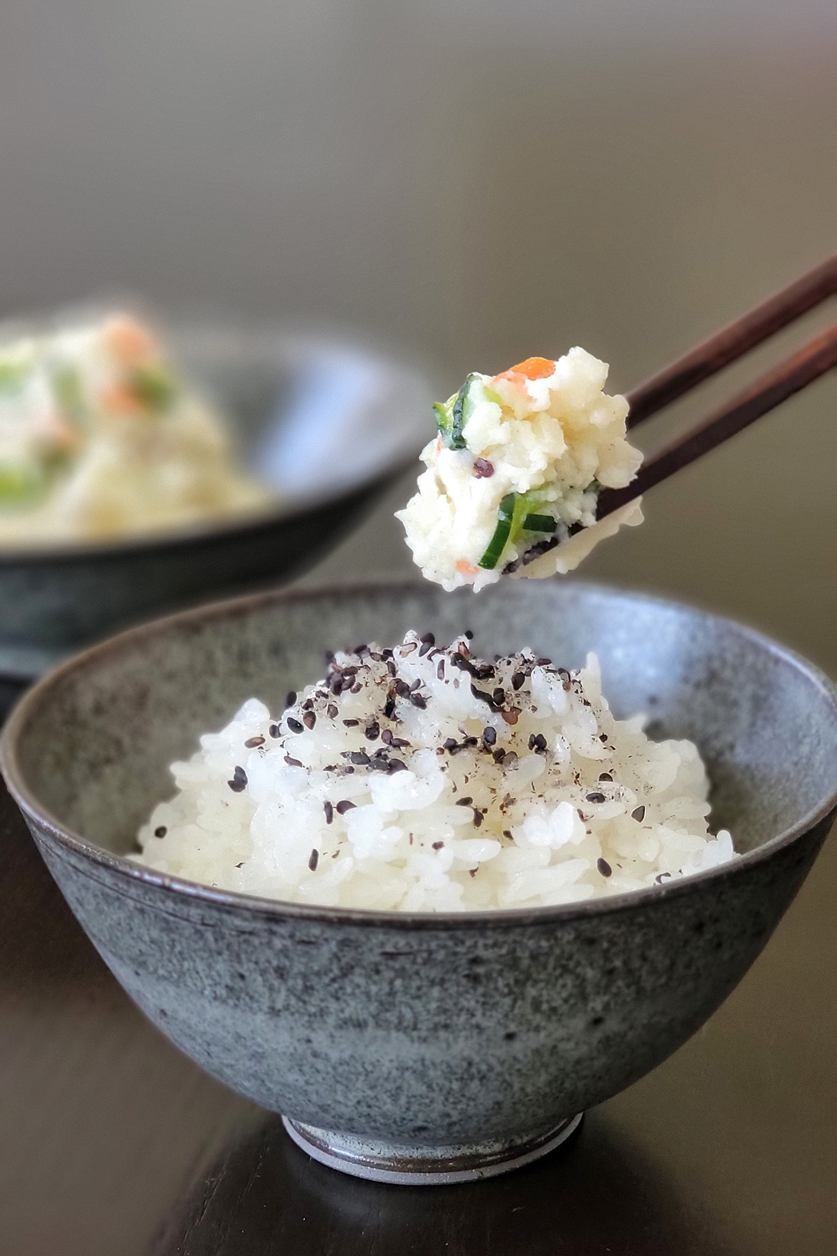 Another difference is that the Japanese potato salad can be a regular side dish but also a side dish to serve with rice.